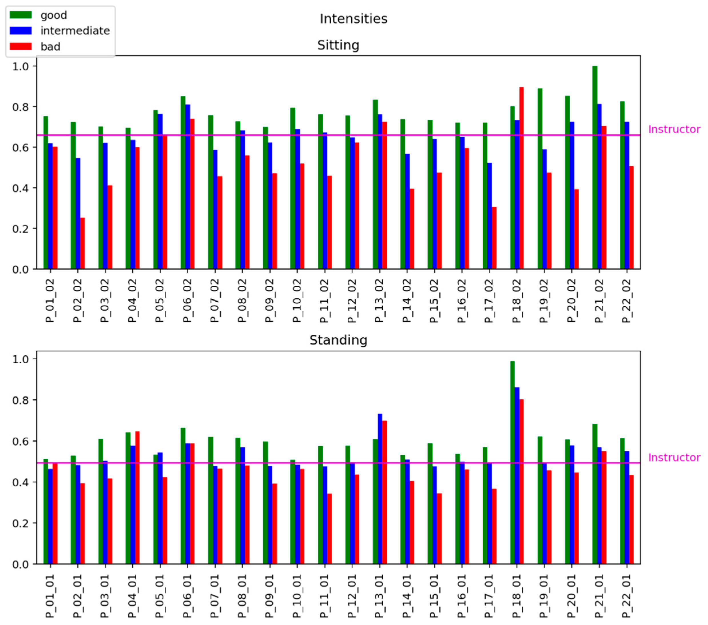 Figure 4 shows the strong relations between the «quality» of exercise (good, intermediate, and bad) in mimicking the instructor’s patterns and the estimation of the intensity of exercises.