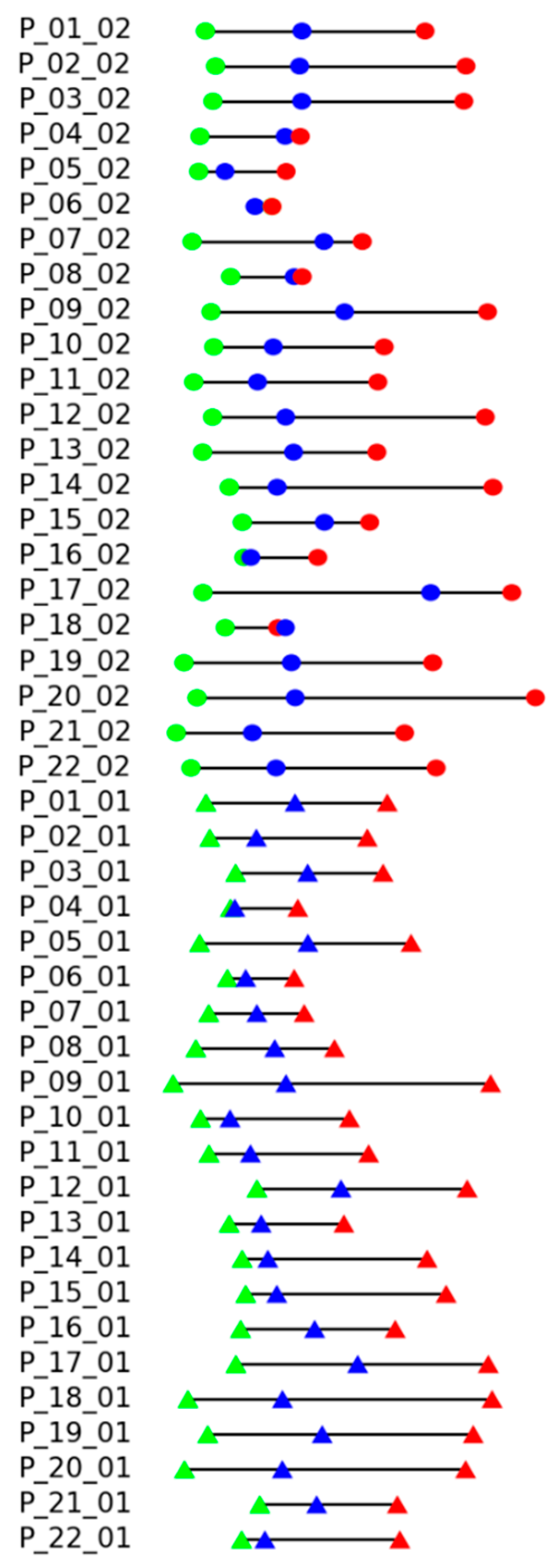 Figure 8. Each line corresponds to the records of certain patients (P_patient number) in the dataset, suffix _01 corresponds to the standing position, and _02 corresponds to the sitting position. The color markers (dots for sitting, triangles for standing exercises) reflect the exercise execution levels: the green color for “good”, blue color for “intermediate”, and red color for “bad”. The proper sequence should be green, blue, and red. A different order of colors indicates an error. Distances between markers reflect the distance