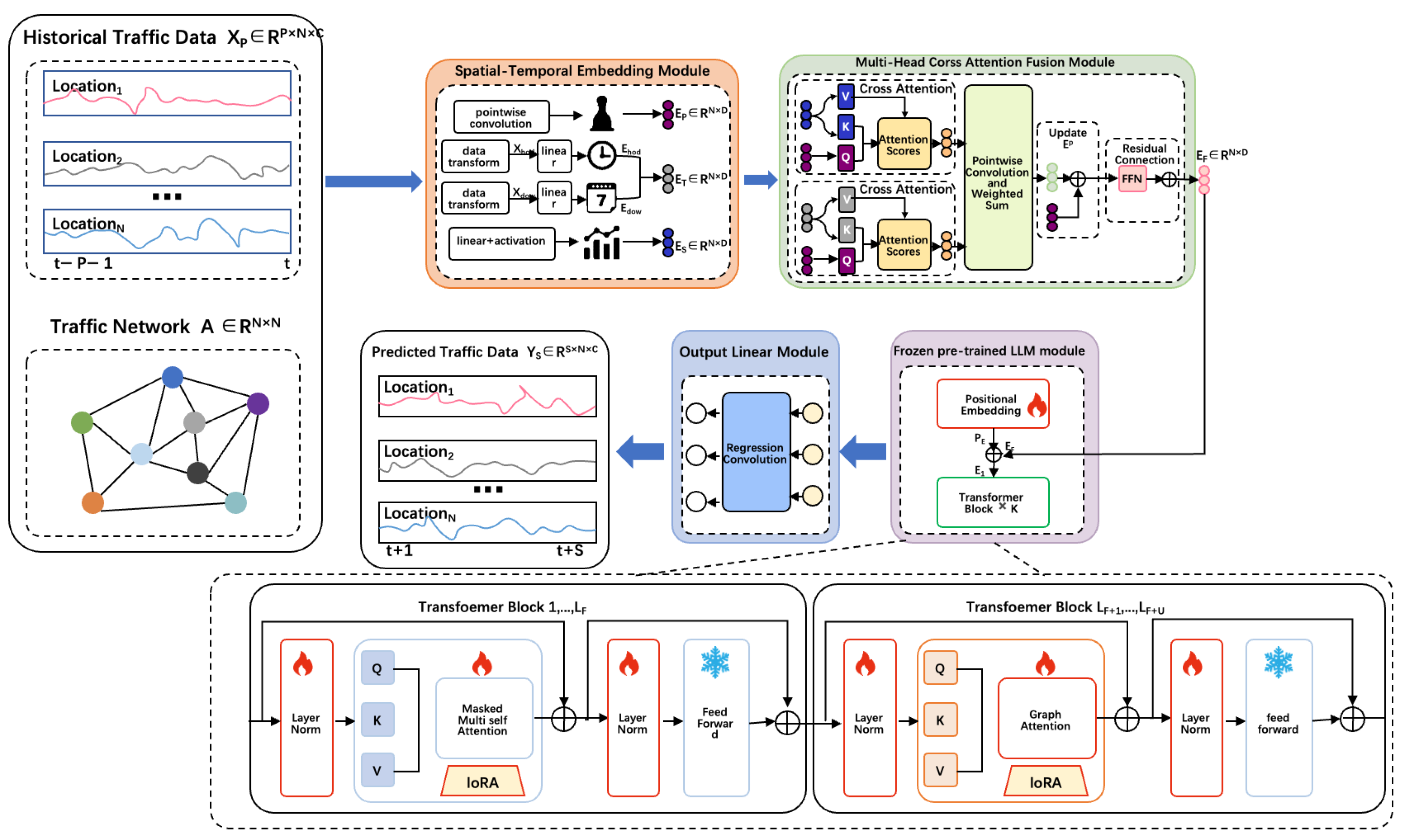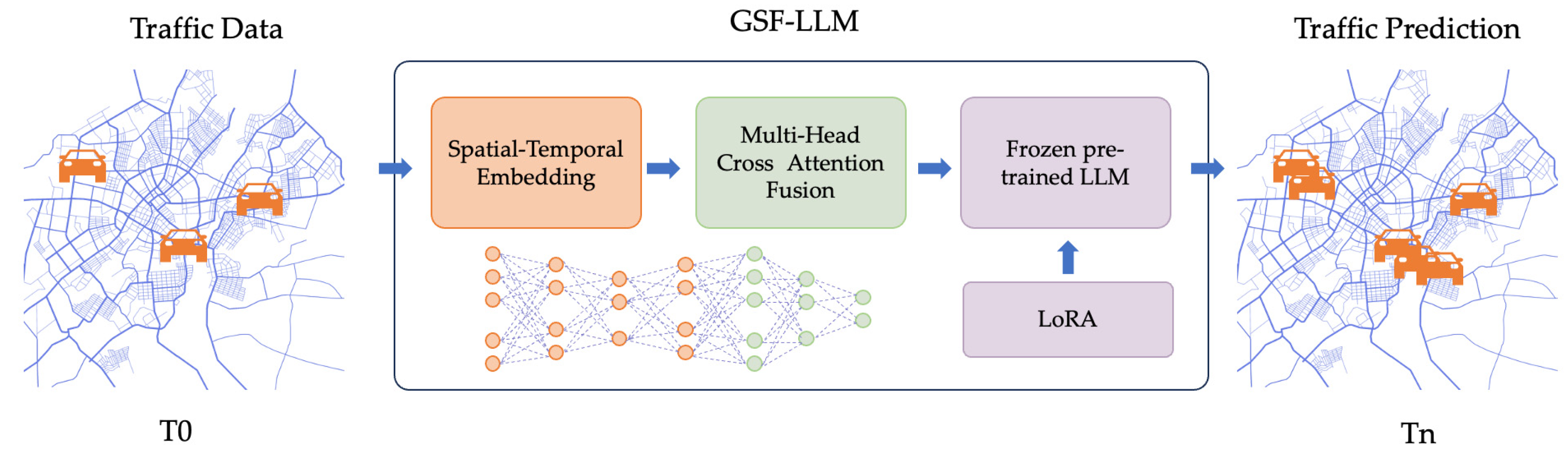 Figure 1, the model employs a multi-branch embedding module to extract token-level, temporal, and spatial representations, which are deeply fused through a multi-head cross-attention mechanism to model intricate cross-modal interactions. To further enhance efficiency without sacrificing accuracy, a frozen pre-trained large language model is fine-tuned using the lightweight low-rank adaptation (LoRA) technique, enabling targeted parameter updates. A regression head is then used to produce multi-step traffic forecasts. By unifying these components, the GSF-LLM overcomes the limitations of prior approaches, achieving more comprehensive spatio-temporal representation learning and improved adaptability to large-scale traffic networks.