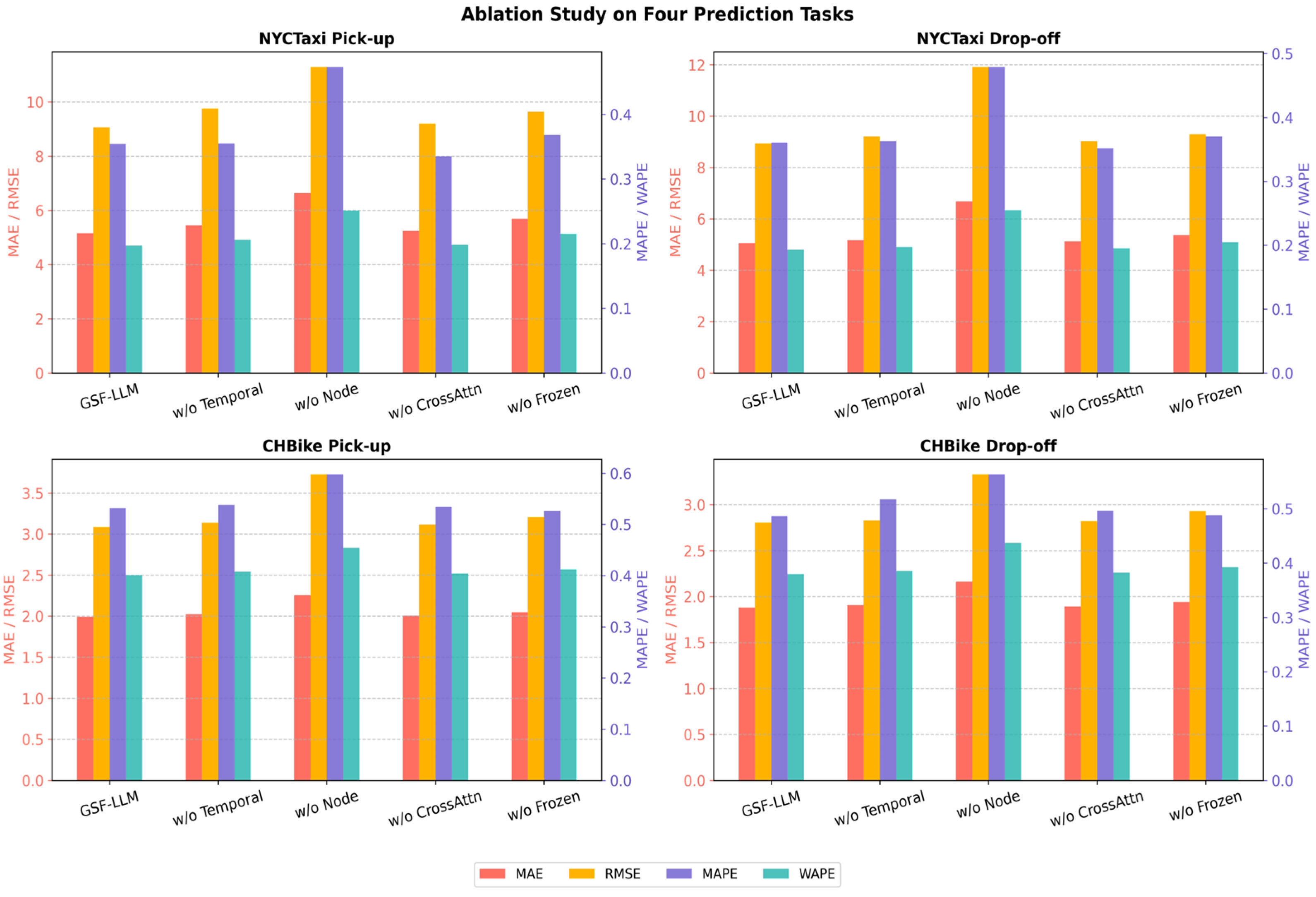 All ablated variants are trained and evaluated under the same settings as the full GSF-LLM, across four prediction tasks derived from the NYCTaxi and CHBike datasets: bike pick-up, bike drop-off, taxi pick-up, and taxi drop-off. We employ four evaluation metrics, namely MAE, RMSE, MAPE, and WAPE, to comprehensively assess model performance.
