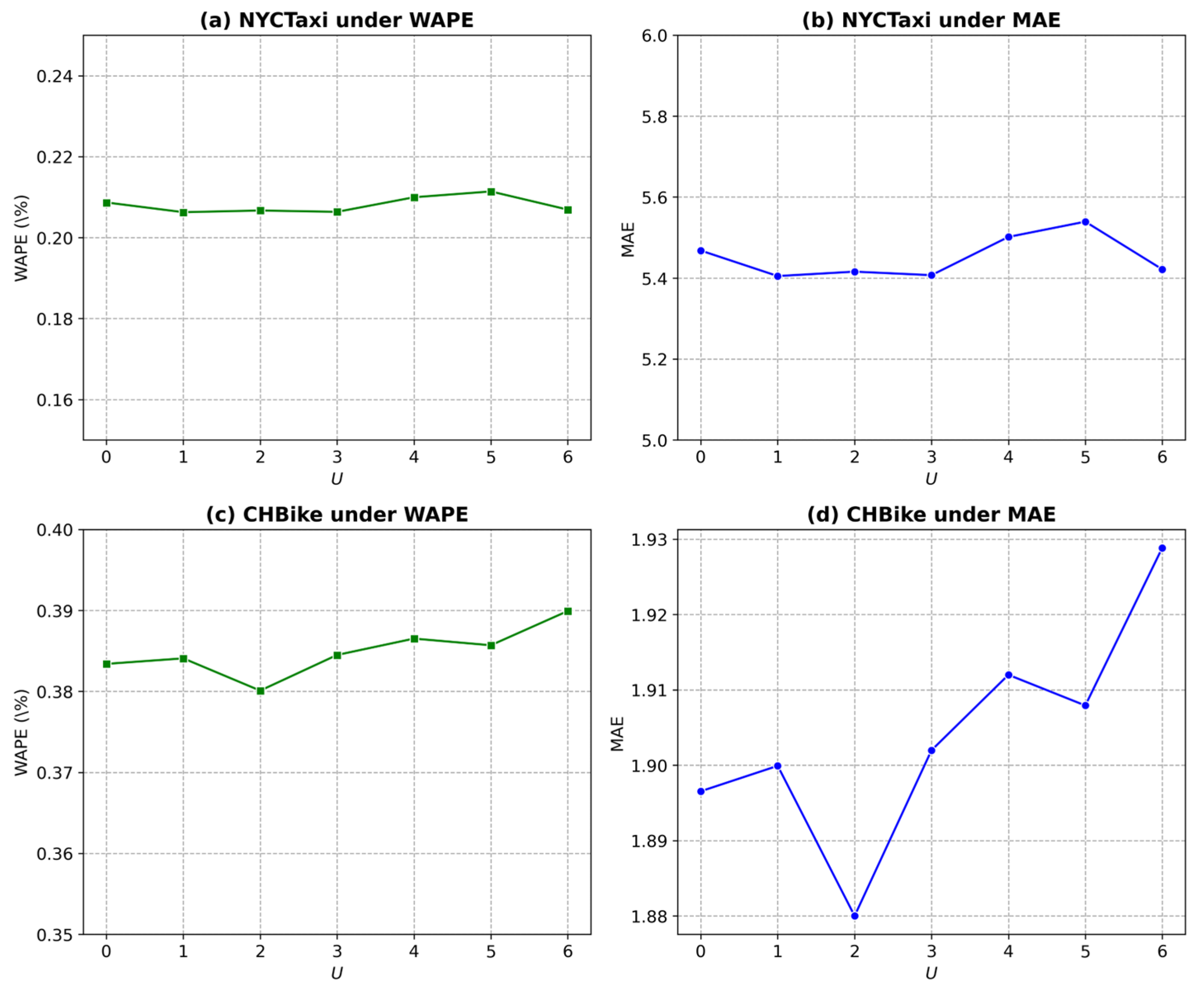 Figure 4c, the lowest WAPE is obtained when U = 2, marking the best model performance. Likewise,
