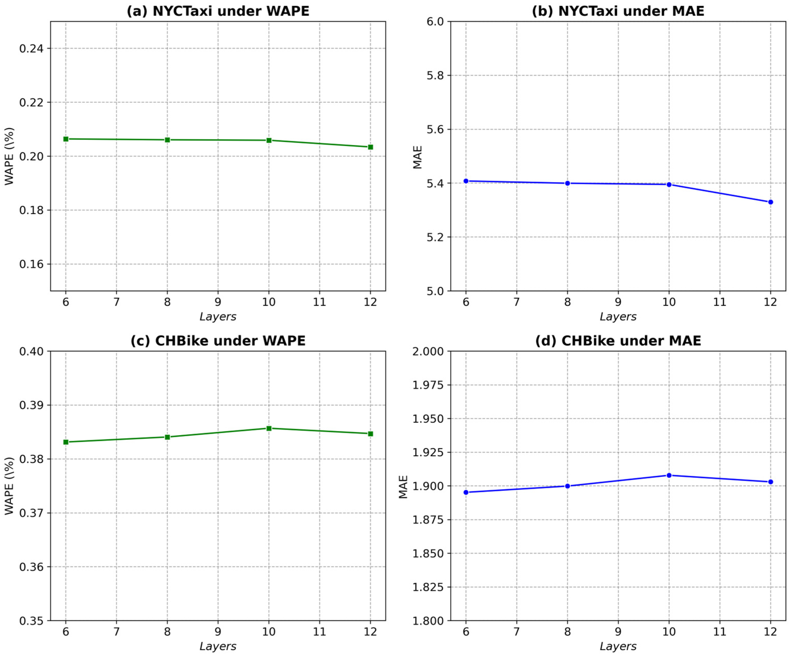 Figure 5d demonstrates that the MAE also reaches its minimum at six layers, after which performance declines as additional layers are included. These results indicate that for the CHBike dataset, retaining six layers strikes an optimal balance between generalization and fine-tuning capability, maintaining model simplicity while ensuring superior predictive performance.