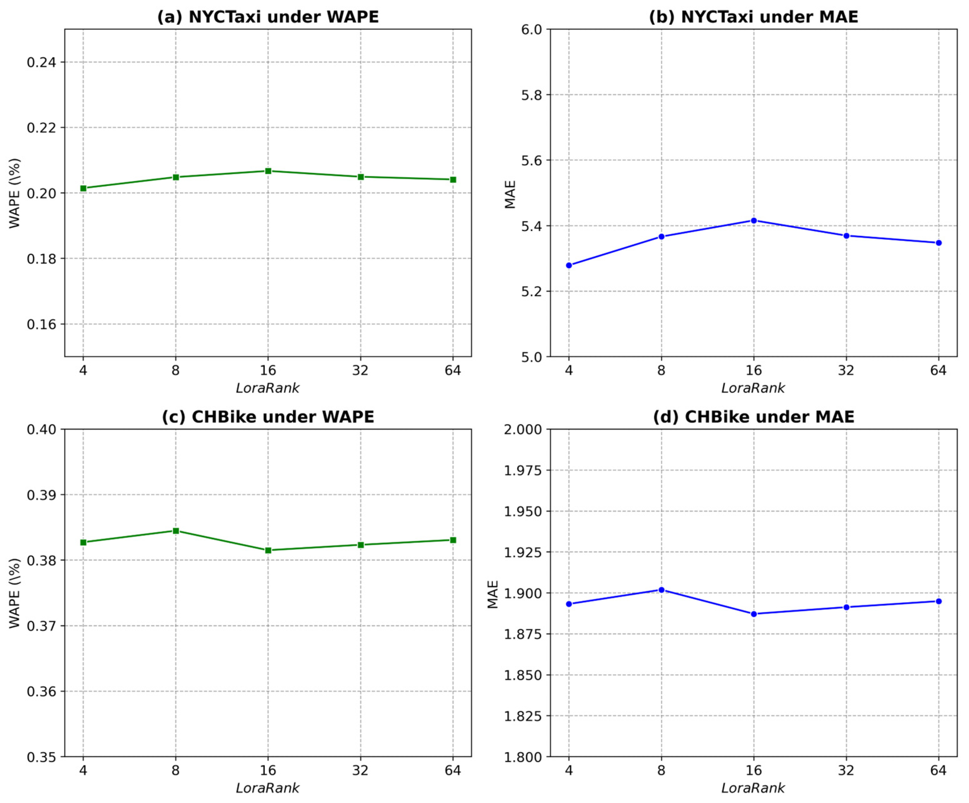 Figure 6a–d, performance variation across different ranks remains minimal, indicating the robustness and stability of the GSF-LLM. Specifically, for the NYCTaxi dataset, WAPE fluctuates slightly within 0.20–0.21%, and MAE varies around 5.3–5.4. For CHBike, WAPE remains approximately 0.38–0.39%, and MAE around 1.88–1.90. The best trade-off is achieved at r = 16, where the model attains slightly higher accuracy while preserving reasonable parameter size and computational efficiency.