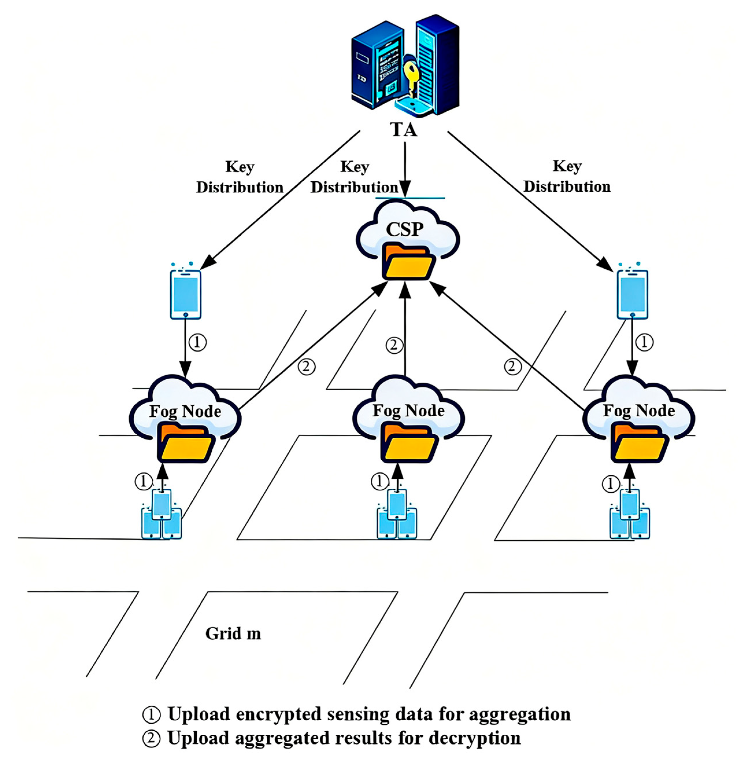 - Yan, X.; Ng, W.W.; Zhao, B.; Liu, Y.; Gao, Y.; Wang, X. Fog-enabled privacy-preserving multi-task data aggregation for mobile crowdsensing. IEEE Trans. Dependable Secur. Comput. 2023, 21, 1301–1316. [Google Scholar] [CrossRef]