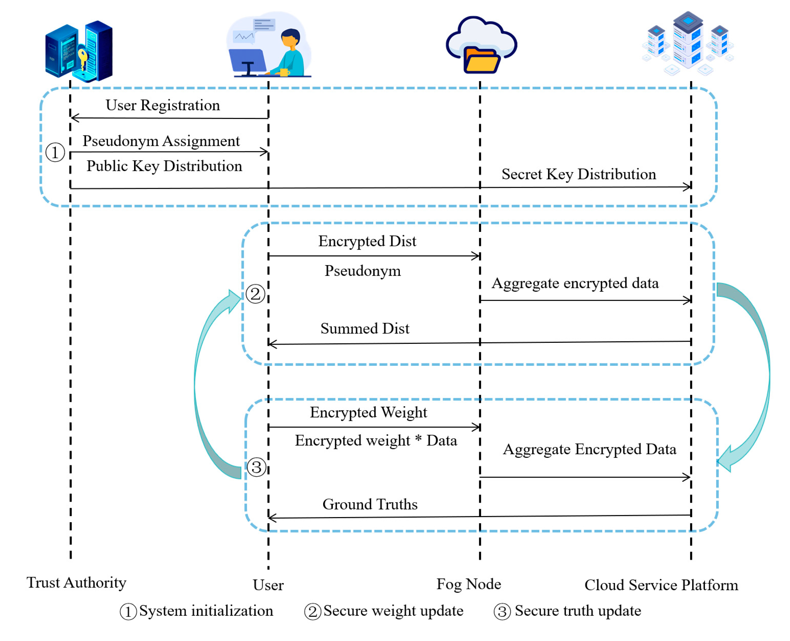 - A fine-grained personalized aggregation scheme is presented that combines truth discovery with Paillier aggregate-only decryption; the FN–CSP distributed structure protects user data and locations while supporting efficient encrypted aggregation.