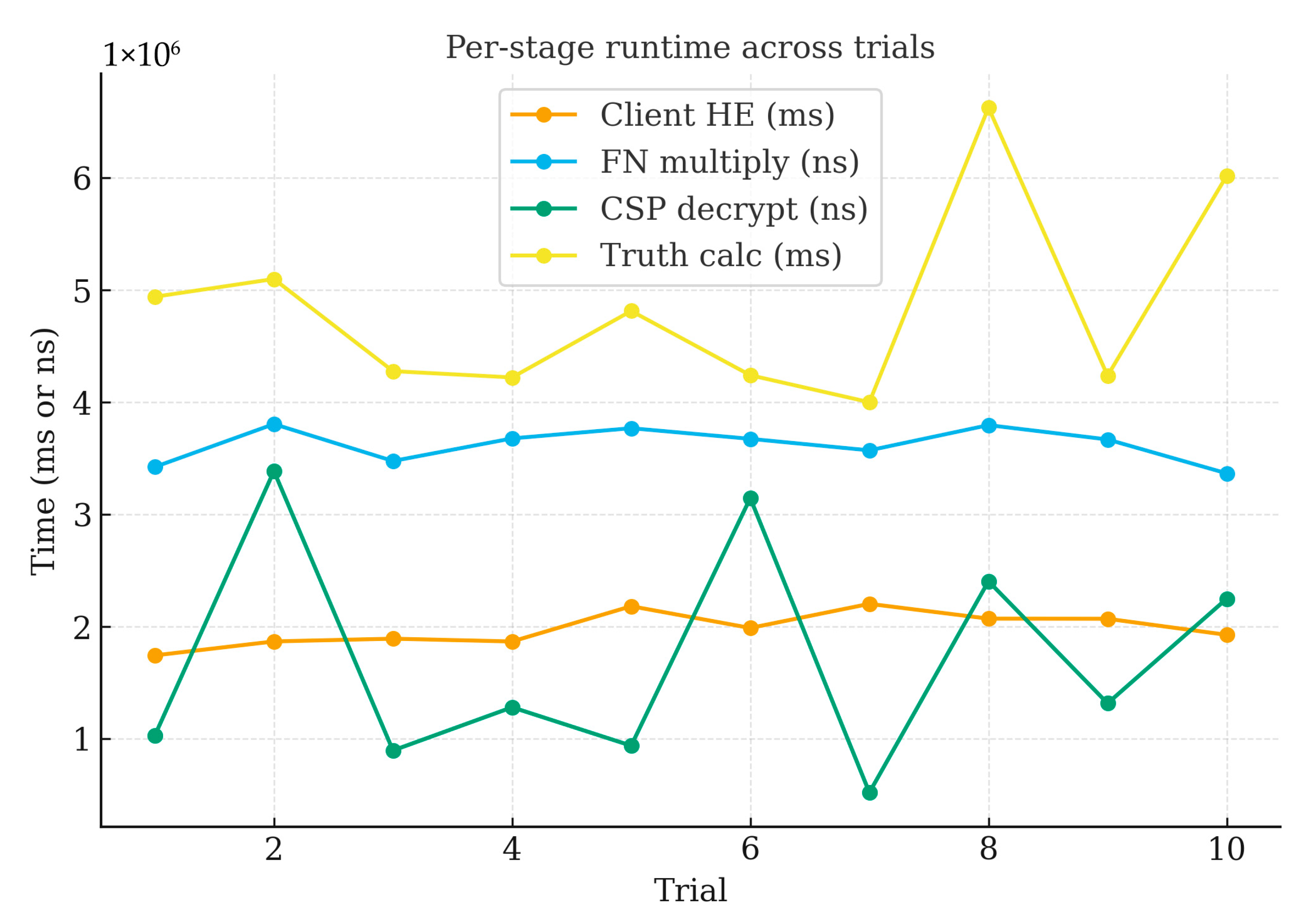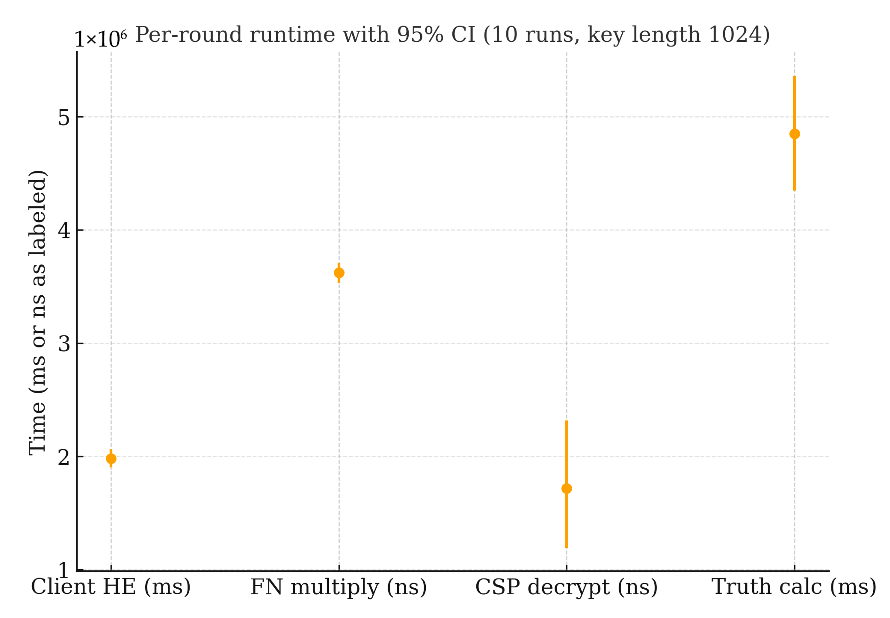 | Users | Total Runtime (min) | Client HE (ms) | FN Multiply (ms) | CSP Decrypt (ms) | Iterations |