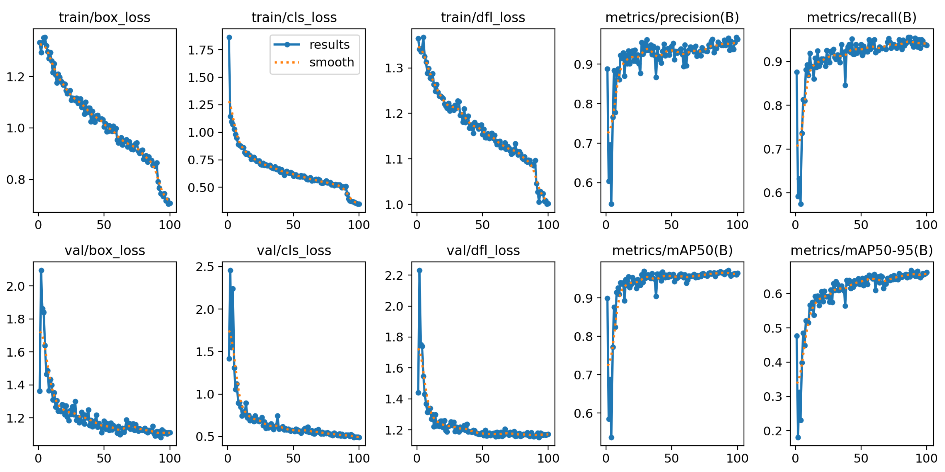 - mAP50-95(B): also Mean Average Precision, showing a standard overall performance score. It is calculated at IoU thresholds from 0.5 to 0.95.