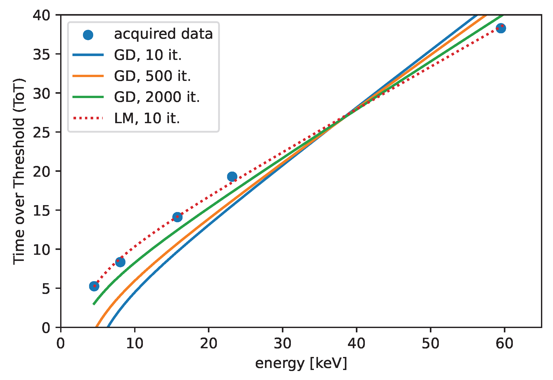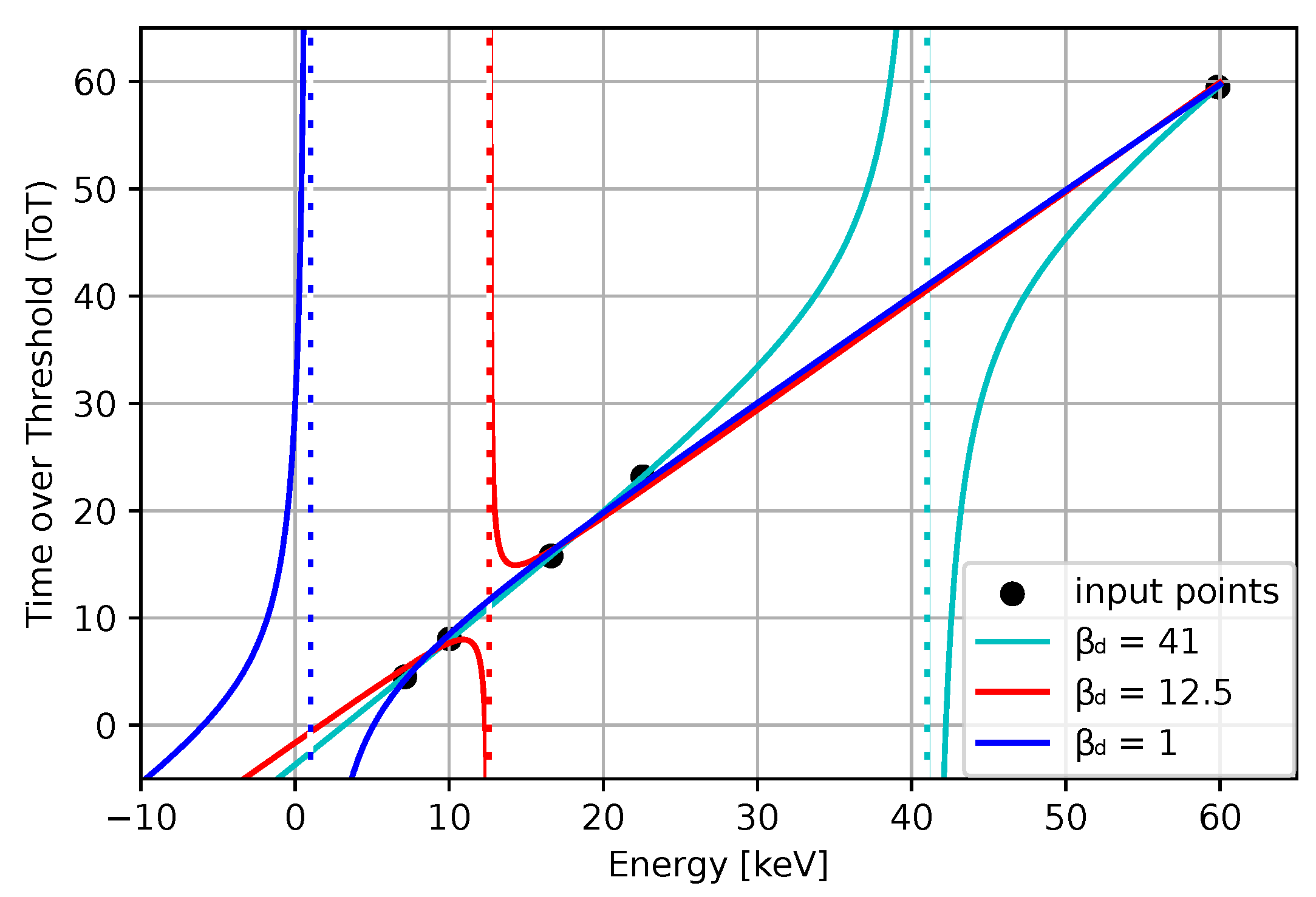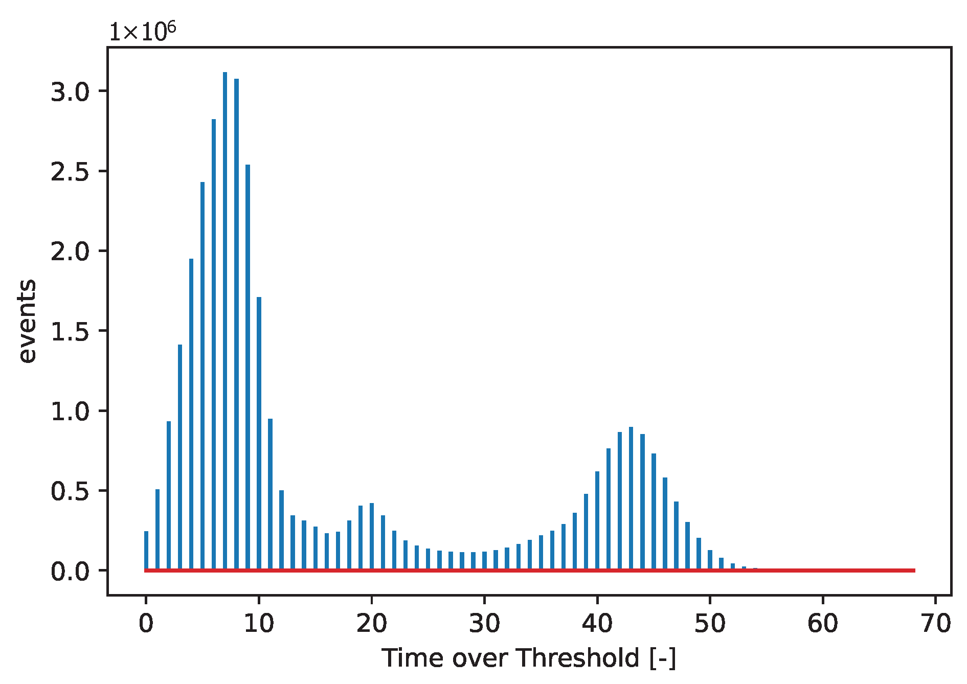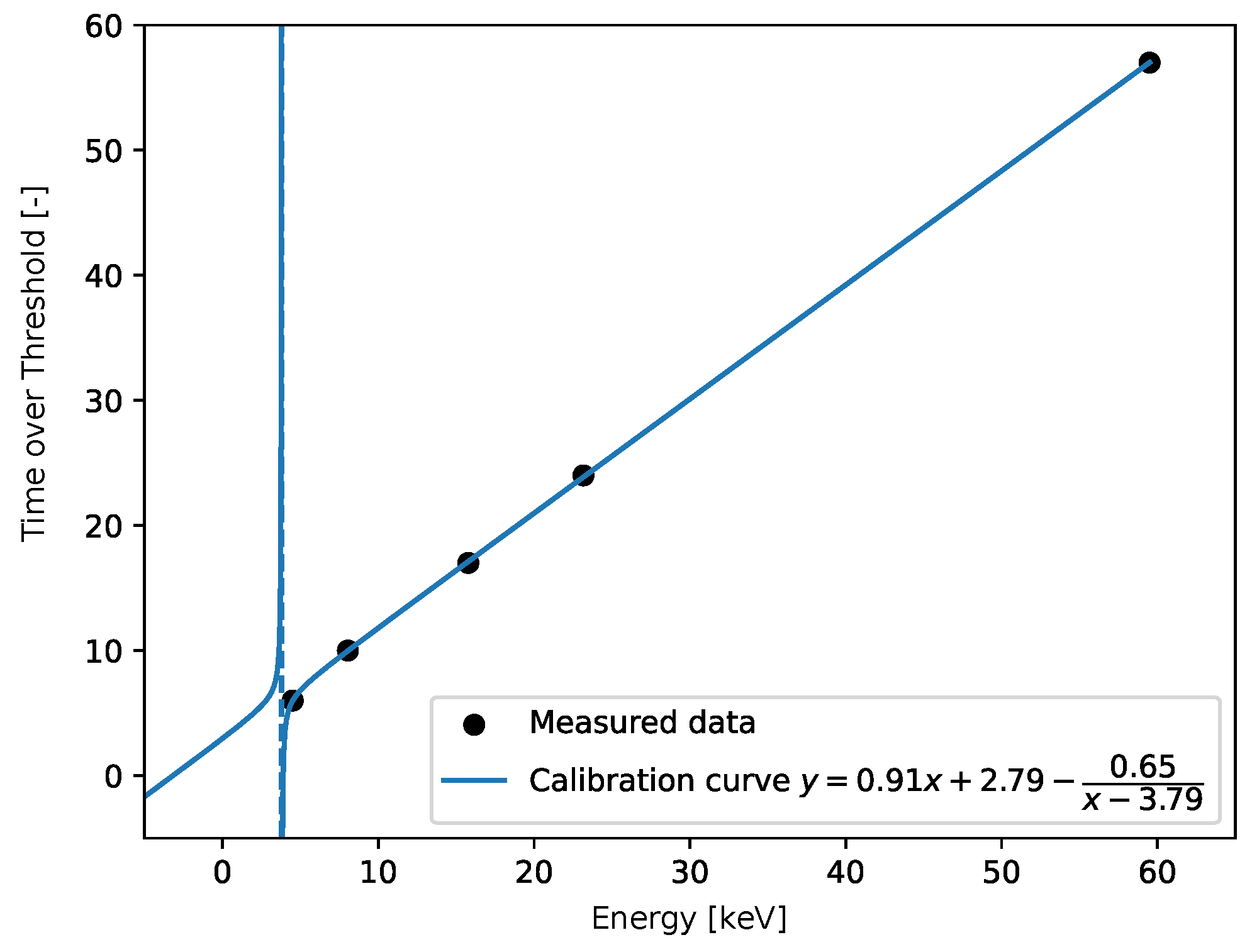 - Turecek, D.; Jakubek, J.; Kroupa, M.; Soukup, P. Energy Calibration of Pixel Detector Working in Time-Over-Threshold Mode Using Test Pulses. In Proceedings of the 2011 IEEE Nuclear Science Symposium Conference Record, Valencia, Spain, 23–29 October 2011; pp. 1722–1725. [Google Scholar] [CrossRef]