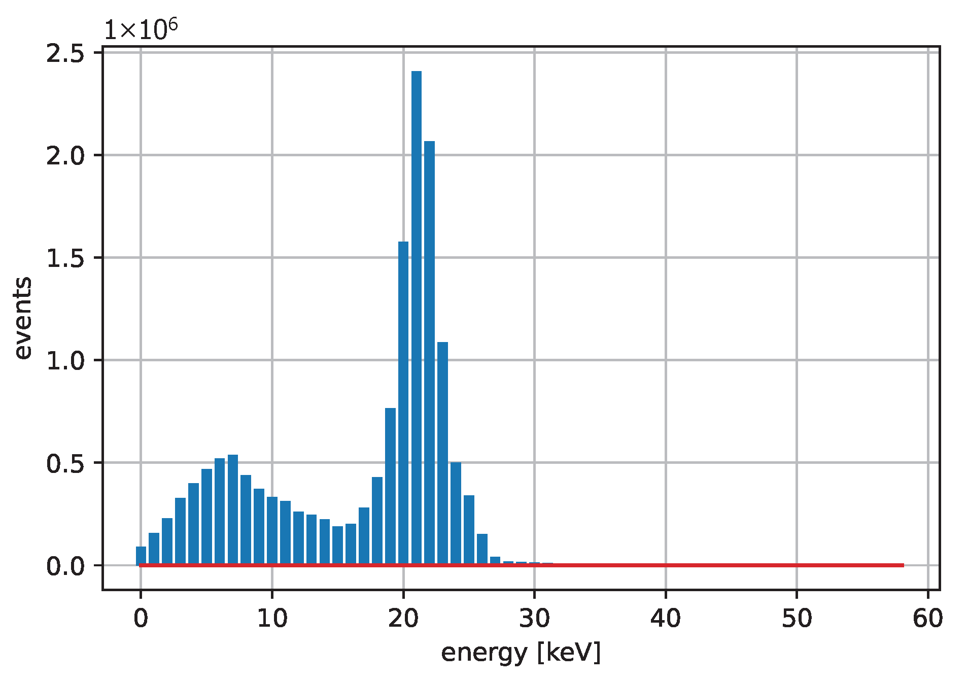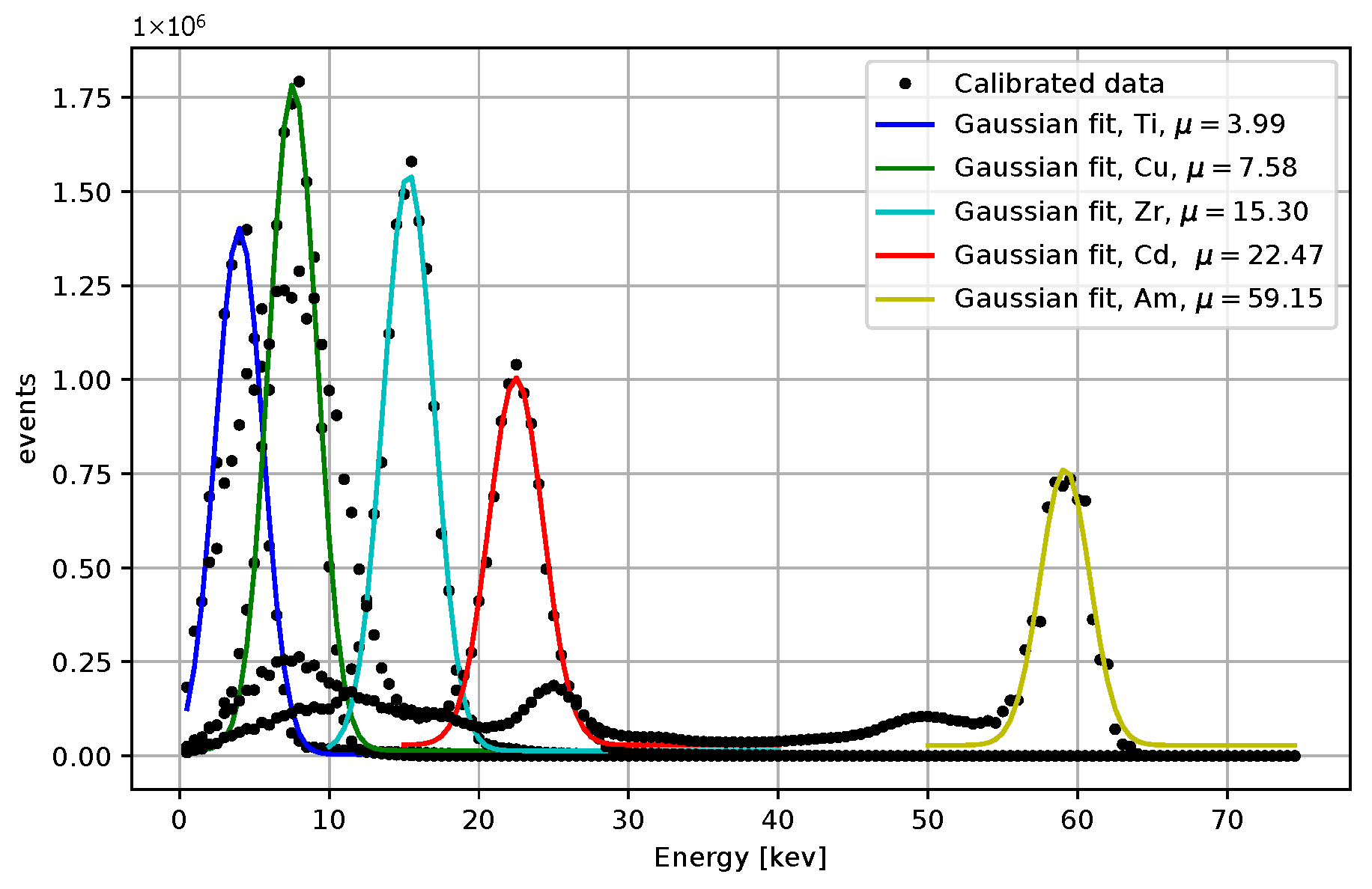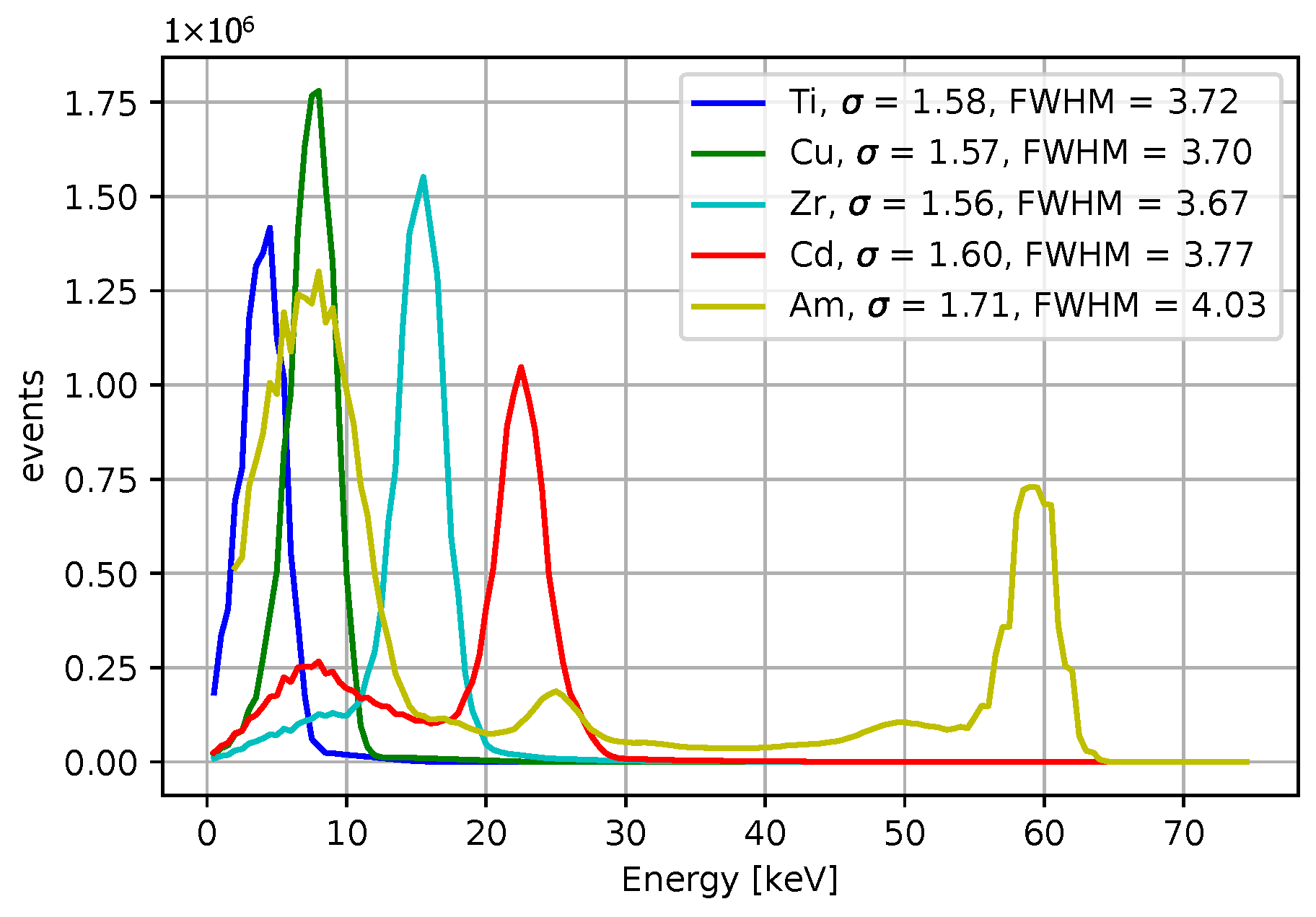 - Ponchut, C.; Ruat, M. Energy Calibration of a CdTe X-ray Pixel Sensor Hybridized to a Timepix Chip. J. Instrum. 2013, 8, C01005. [Google Scholar] [CrossRef]