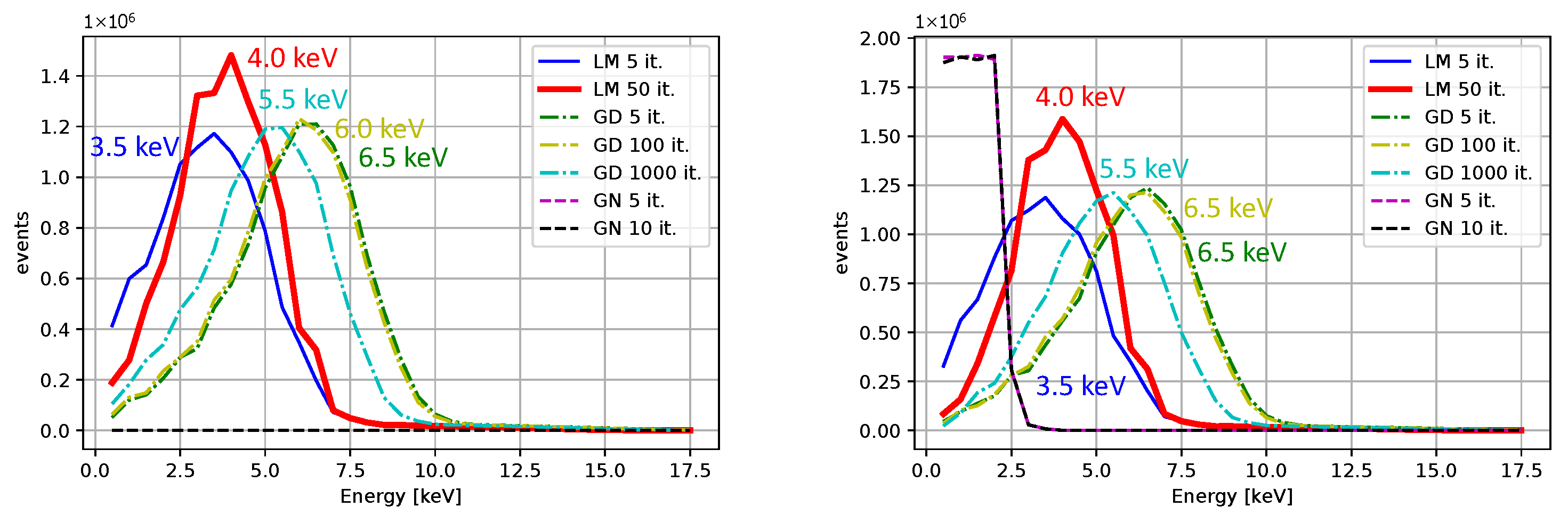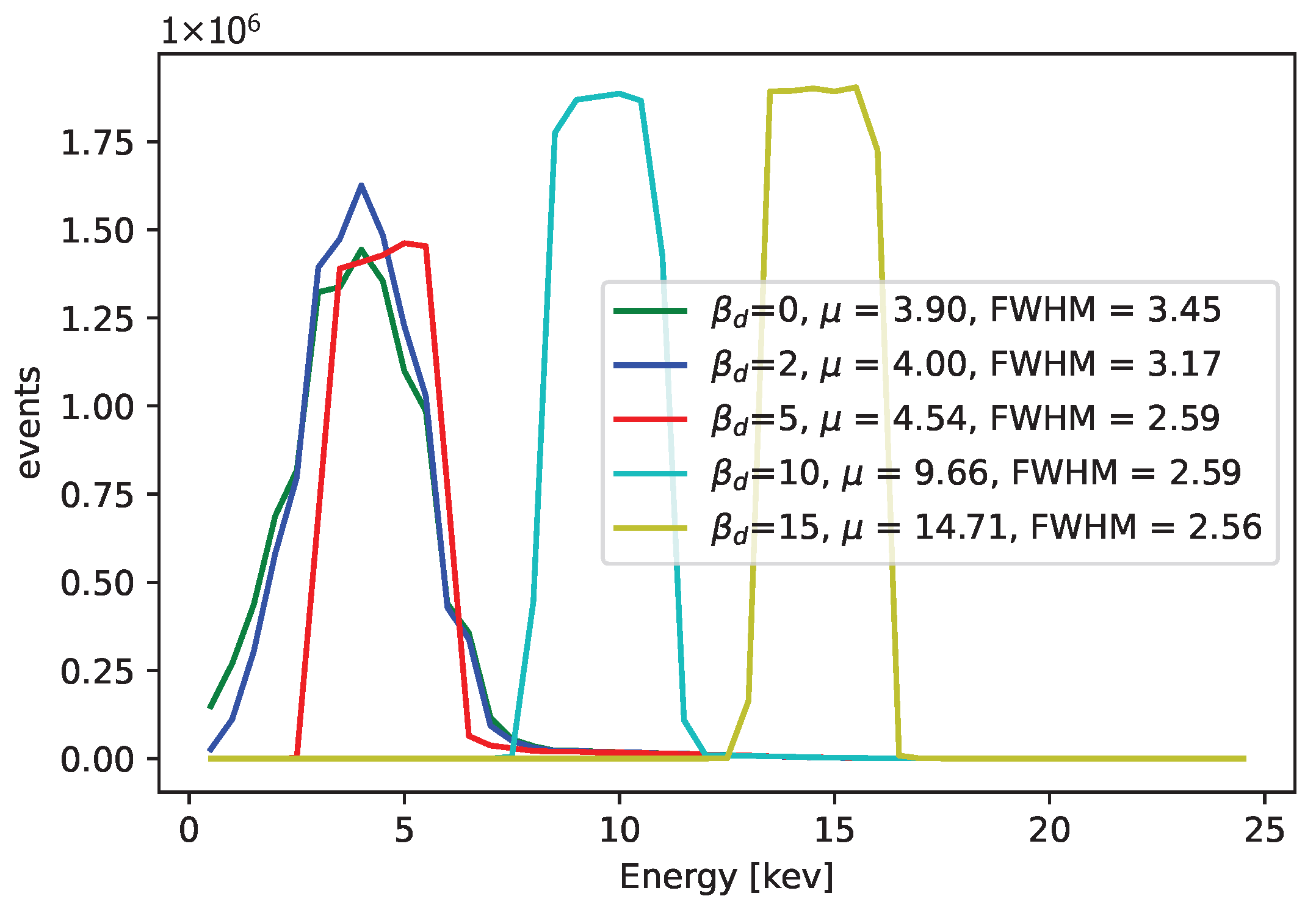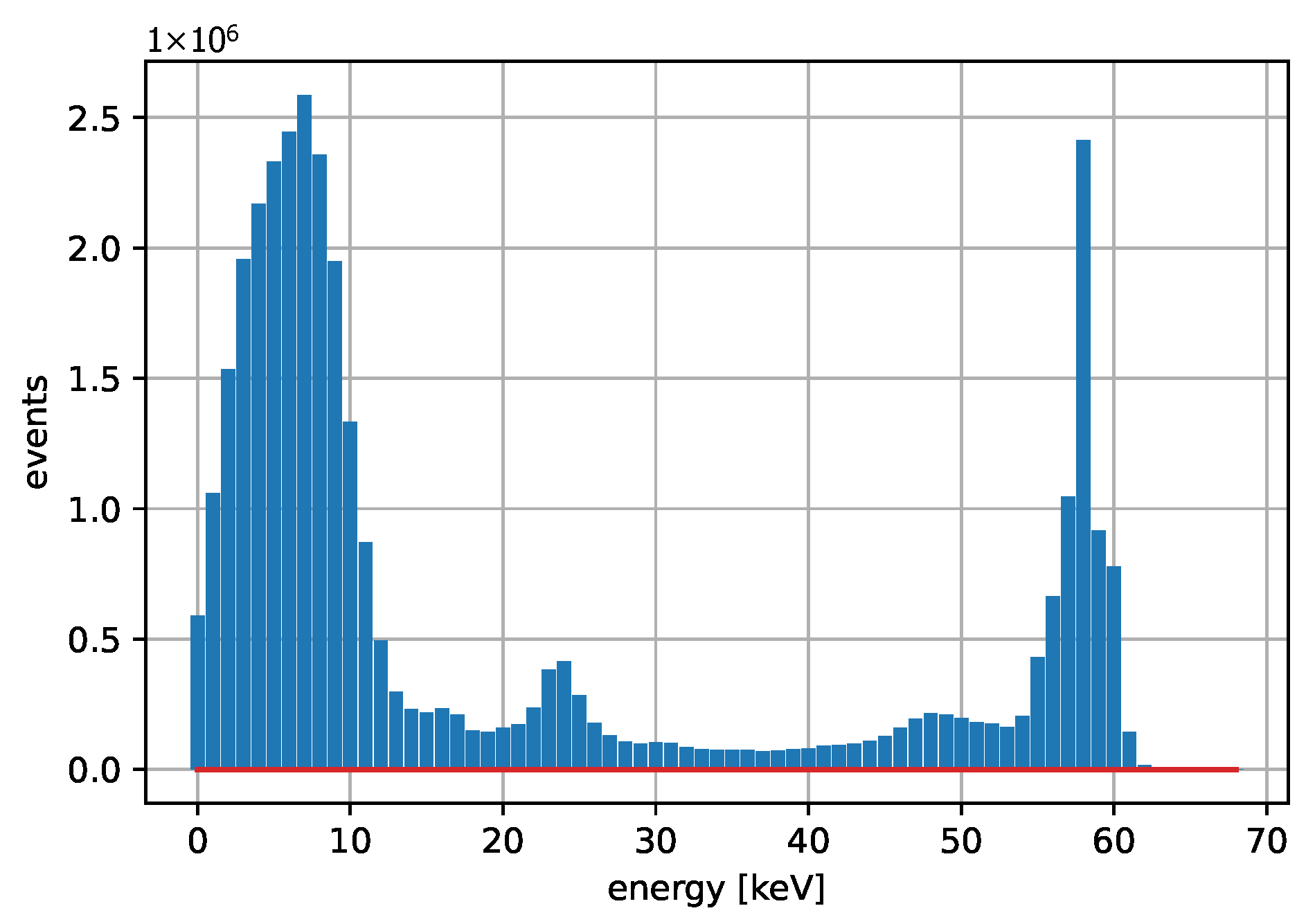 - Ponchut, C.; Ruat, M. Energy Calibration of a CdTe X-ray Pixel Sensor Hybridized to a Timepix Chip. J. Instrum. 2013, 8, C01005. [Google Scholar] [CrossRef]