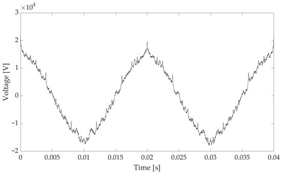 The acquisition system is configured in the following way: every hour, a voltage waveform of 1 s duration is acquired at 500 kSa/s. The acquisition is automated by means of the Matlab 2024 software, and the acquired waveforms are saved in laptop memory. To better clarify what has been acquired, the reader can refer to Figure 2, in which it has been highlighted that the Hall effect sensor acquires the voltage that the inverter produces and that the final user would use.