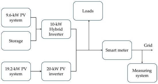With the help of Figure 2, the functioning of the system under analysis can be summarized as follows: the power generated by the PV is managed by two inverters and depending on the load demand, it is directly consumed by this load, stored in the battery or fed into the grid.