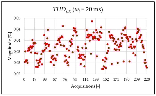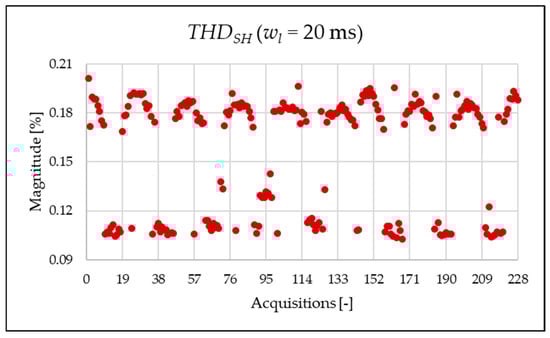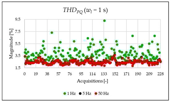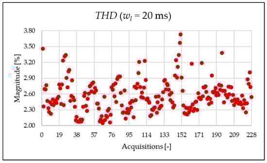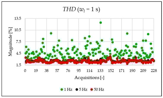 After presenting all results, a comment on their variability and accuracy is needed. First, it is commonly difficult to perform repeated measurements on real networks due to lack of stability of the signal. Therefore, the statistical approach to reduce uncertainty cannot be used. Second, in this case, the information that is received from the instrumentation is crucial. In fact, as presented in [], the authors guide the user to the calculation of the uncertainty associated with THD indices with a closed-form expression that uses the collected waveforms as a starting point.