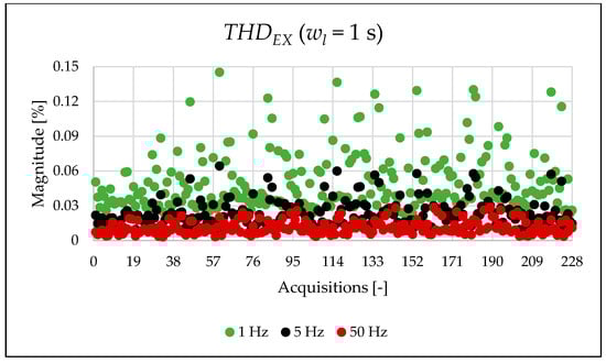 Figure 10, Figure 11, Figure 12 and Figure 13 show the proposed indices, each of which is dedicated to a specific portion of the spectrum. A first general comment is that, in most cases, the results obtained with a 50 Hz resolution are overlapping with those obtained with the 5 Hz resolution. This is always true but for the case of . This is reasonable because in that frequency range, the components are not related to the fundamental component anymore. A second comment is on the absolute values obtained. The proposed indices provide a clear and detailed indication about the significance of each portion of the spectrum. Such information is fundamental for an immediate quantitative PQ analysis of the signal.