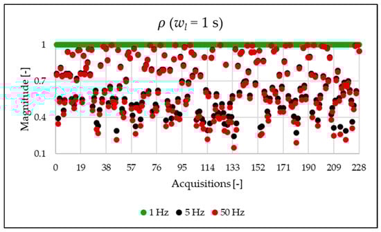 To validate the indices described in Section 3, they are applied on signals S1 and S2, described above. In particular, the signal is assumed to be sampled with time windows of 1 s, 200 ms, and 20 ms to recreate the condition of a frequency resolution of 1 Hz, 5 Hz, and 50 Hz, respectively. Note that, in the considered case of a constant signal, there is no dynamicity in the frequency components. Therefore, the time window is solely used to change the frequency resolution and not for assessing specific time-varying frequency components. Finally, to obtain the frequency spectrum of the sampled signal in the time domain, the Fast Fourier Transform (FFT) is applied to each time window. Then, for the calculation of the proposed indices and metrics, only the amplitude values of the complex FFT are used. The phase information is not considered in this analysis, and the amplitude values are used for the calculation of the following indices (presented in Section 3).