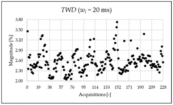 A final comment on this first set of results is about the frequency resolution. It is known that the standard [] suggests sampling the signal collecting 10 or 12 periods of the fundamental component (50 Hz or 60 Hz). However, it is not always possible due to the available instrumentation, duration of the signal, or the duration of the phenomena of interest. Therefore, the flexibility and simplicity of the indices become crucial for their widespread adoption.