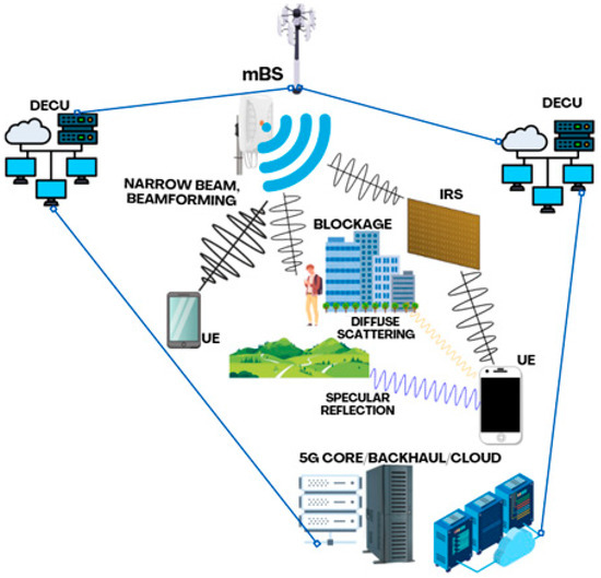 The mBS units act as the primary access point, designed to operate in sub-THz (0.1–0.3 THz) and THz (0.3–3 THz) bands, offering flexible spectrum utilization. Each mBS is equipped with massive Multiple-Input Multiple-Output (mMIMO) arrays of up to 256 elements and advanced beamforming capabilities to overcome the high path loss inherent to these frequencies [4]. The DECUs, in turn, play a crucial role by enabling edge computing capabilities, allowing for ultra-low latency applications and reducing the burden on the core network. Finally, the IRS units are passive surfaces strategically positioned to enhance coverage and mitigate blockage effects, which are particularly severe at THz frequencies, by intelligently reconfiguring the reflected wavefront [8].