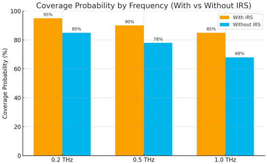 The coverage probability results presented in Figure 2 were generated through a comprehensive Monte Carlo simulation campaign. The integrated MATLAB–Python RNP simulation tool was used to execute this campaign as follows: The core of the simulation, developed in MATLAB, was responsible for generating the network geometry for each “snapshot” by randomly placing mBSs and users according to the densities specified in Table 4. For each user, the engine calculated the path loss to the serving mBS and determined if the received signal strength was above the minimum sensitivity threshold. A high-level Python script then automated this process, managing tens of thousands of independent simulation runs. The Python script handled the large-scale parameter sweeps (e.g., iterating through different frequencies and with/without IRS), aggregated the pass/fail results from all snapshots, and computed the final coverage probability statistics, including the 95% confidence intervals. This combined framework allowed for an efficient and statistically robust evaluation of the system’s performance.
