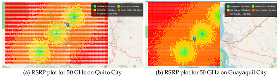 Spatial distribution of RSRP values in the Quito and Guayaquil scenarios. The color scale, defined in the legend, represents the received power levels from “Excellent” (>−60 dBm) to “No Signal” (<−120 dBm), averaged over the coverage area.