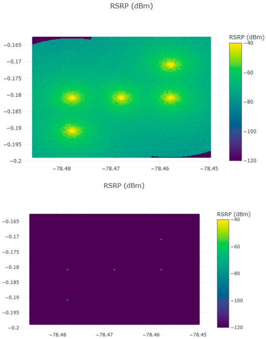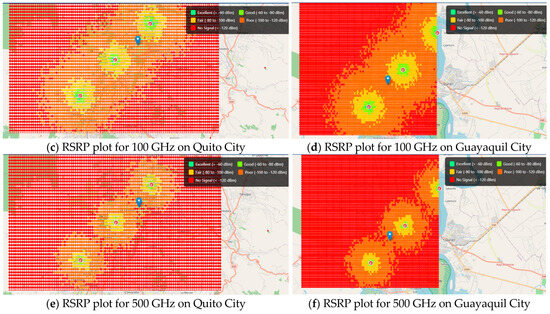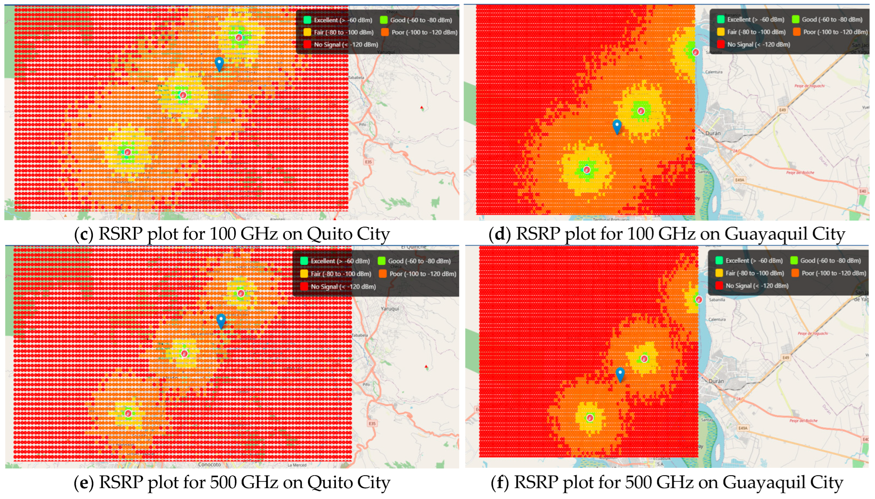 Table 7 shows the main simulation parameters for obtaining Reference Signal Received Power (RSRP) coverage plots for both cities by using the THz Radio Network Planning (RNP) simulation tool (Matlab, Python):
