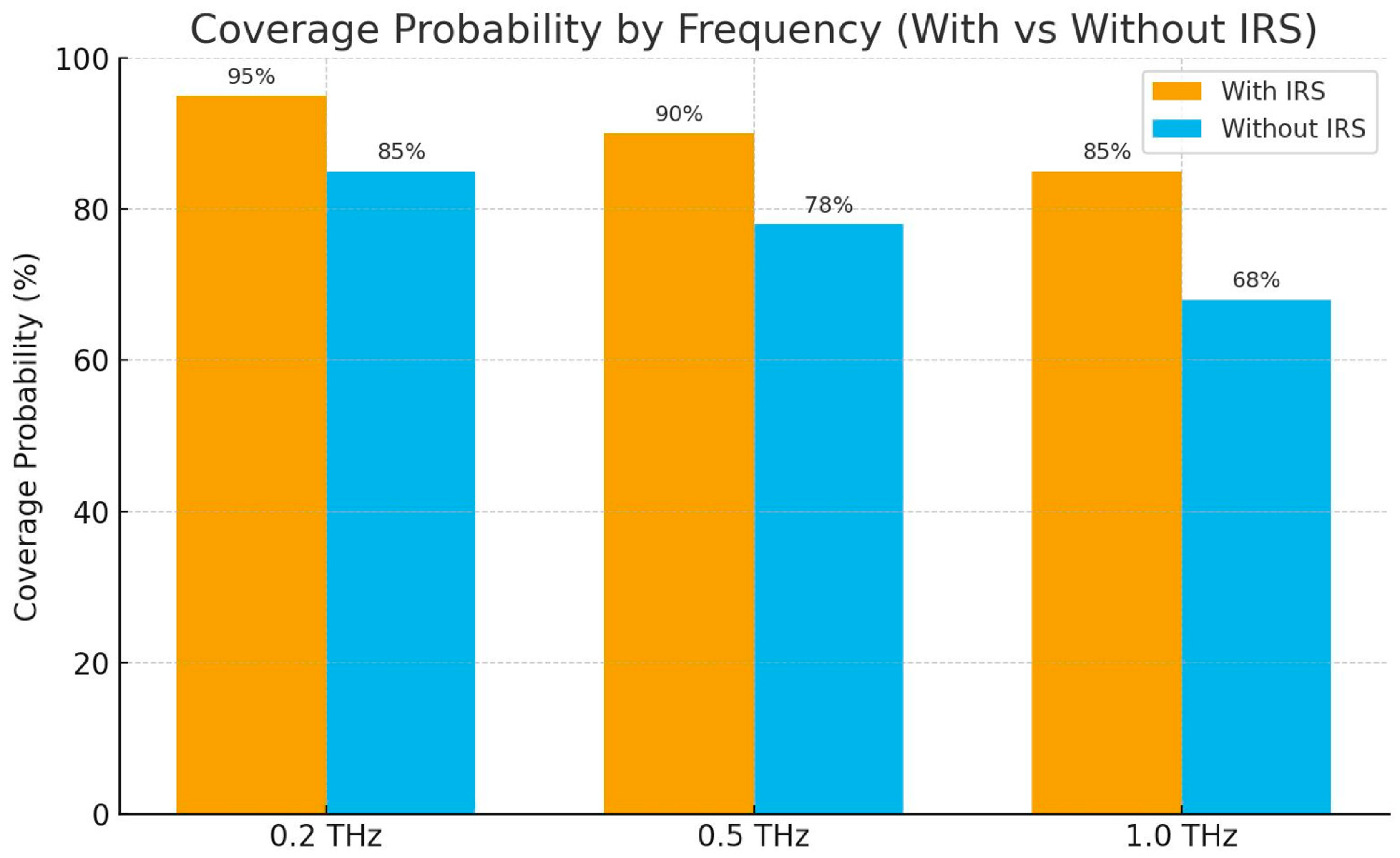 Table 4. For each user, the engine calculated the path loss to the serving mBS and determined if the received signal strength was above the minimum sensitivity threshold. A high-level Python script then automated this process, managing tens of thousands of independent simulation runs. The Python script handled the large-scale parameter sweeps (e.g., iterating through different frequencies and with/without IRS), aggregated the pass/fail results from all snapshots, and computed the final coverage probability statistics, including the 95% confidence intervals. This combined framework allowed for an efficient and statistically robust evaluation of the system’s performance.