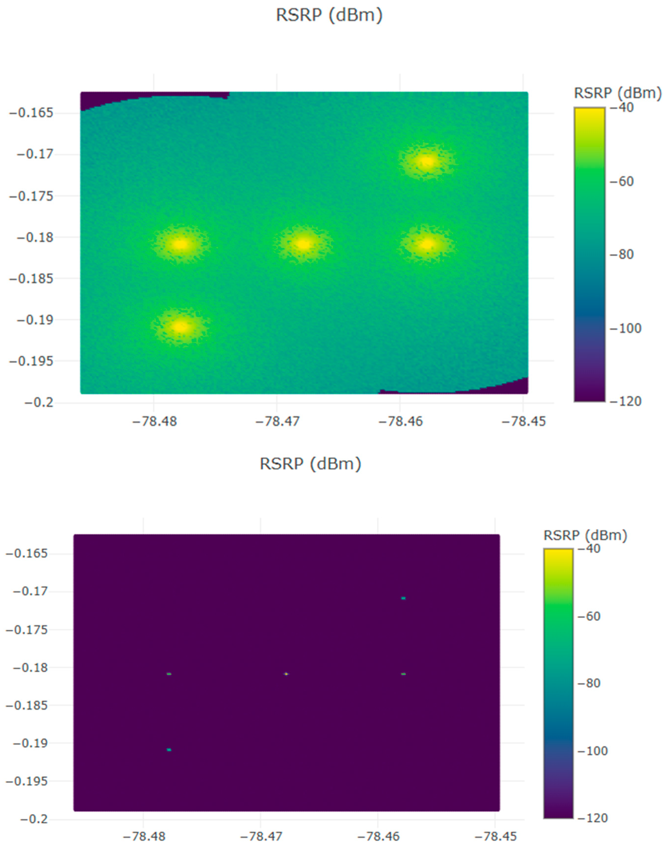 Figure 4 contrasts simulated propagation for the 0.140 THz case without (up) and with (bottom) the inclusion of local climatic and building-condition effects for the Quito mini-cluster scenario (5 BSs). The left panel shows the idealized propagation pattern driven only by geometric path loss and antenna directivity, while the right panel shows the additional attenuation and shadowing caused by realistic urban features (building blockage, street-canyon effects) and atmospheric absorption. The comparison highlights two main effects: (i) reduced contiguous coverage areas and deeper local fades when climatic/building effects are included and (ii) stronger spatial variability in received power leading to higher cell-edge loss and reduced coverage probability for a given MAPL. Readers should thus interpret left/right panels as best-case vs. realistic propagation envelopes under the same deployment geometry and transmit settings.