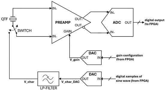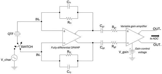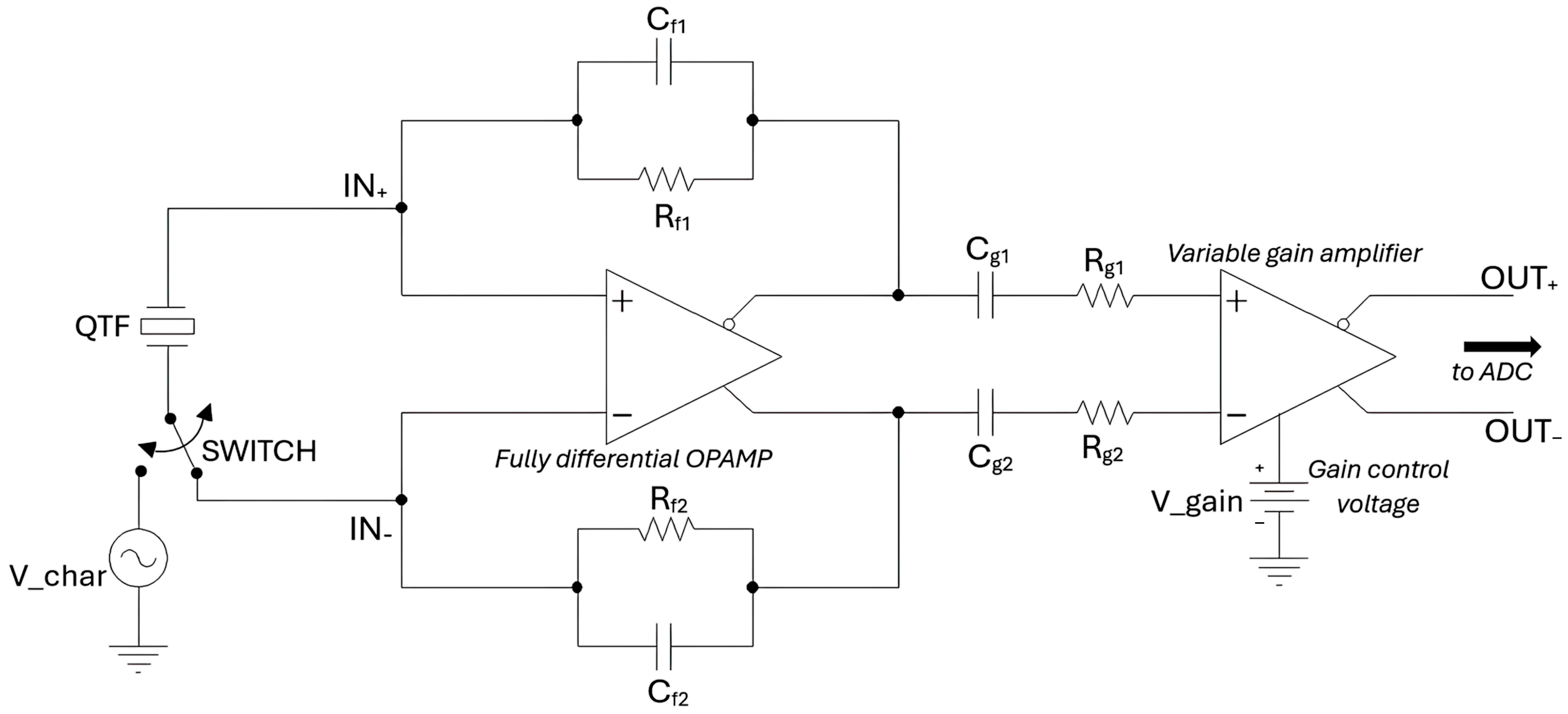 The QTF is DC-connected directly to the inputs of the first stage during the QEPAS operating mode of the sensor, or it can be connected directly to an external sinusoidal input stimulus with variable frequency V_char, by means of a digitally controlled switch, during the QTF characterization process. In characterization mode, the QTF generates a sinusoidal current in response to the external excitation, and this signal can be used to determine the resonant frequency of the sensor, identifying the frequency corresponding to the maximum amplitude response. This same frequency, or a sub-harmonic, is subsequently employed to modulate the laser in QEPAS operating mode, thus ensuring excitation of the QTF at its resonance and maximizing the signal level at the sensor output [].