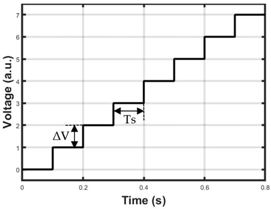 First of all, the laser diode must be fed with a current source controlled by a waveform generator. When the QEPAS sensor is operated in the so-called scan mode, the laser emission wavelength must be varied around the absorption line of the target gas in order to accurately identify its location. Therefore, the signal that controls the laser current is composed of two superimposed components: a staircase signal, as depicted in Figure 7, needed to scan the wavelength interval of interest, and a small amplitude sine wave, needed to modulate the laser intensity at the resonant frequency of the QTF or one of its sub-harmonics. The duration TS of the single step must allow the completion of the lock-in operation and depends on the value selected for the integration time of the LIA. Both TS and the amplitude ΔV of the single step have programmable values.