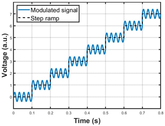 Concerning the modulation sine wave, a classic 2f demodulation scheme was adopted for the QEPAS sensor. In this approach, the modulation frequency of the laser source is , where is the resonant frequency of the QTF, whereas the demodulation frequency for the signal produced by the QTF, i.e., the reference frequency of the LIA, is equal to . Even though the 2f demodulation scheme in scan mode does not allow extracting the shape of the absorption line of the target gas without distortion, it is able to provide the peak of the signal in correspondence with the peak of the absorption line without errors. Moreover, the peak value is free from constant background contribution, and as a consequence, background compensation schemes are not needed [,]. Thus, the function generation module integrated in the FPGA outputs the samples of a sine wave signal with frequency and programmable amplitude so that it is possible to vary the modulation index and to adapt the signal amplitude to the laser driver of choice. The resolution of the sine wave samples is 14 bits, and the rate is about 165 kS/s. As mentioned, the modulation signal is added to the value of the staircase to generate a voltage signal represented in principle in Figure 8, to be used to control the output current of the laser driver.