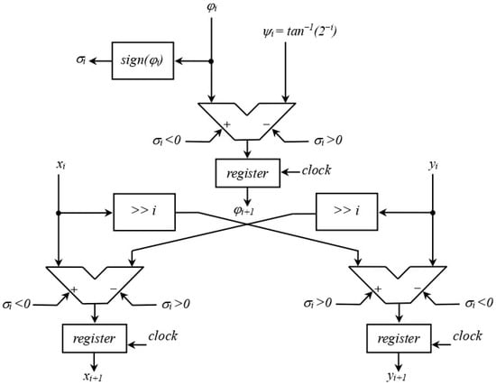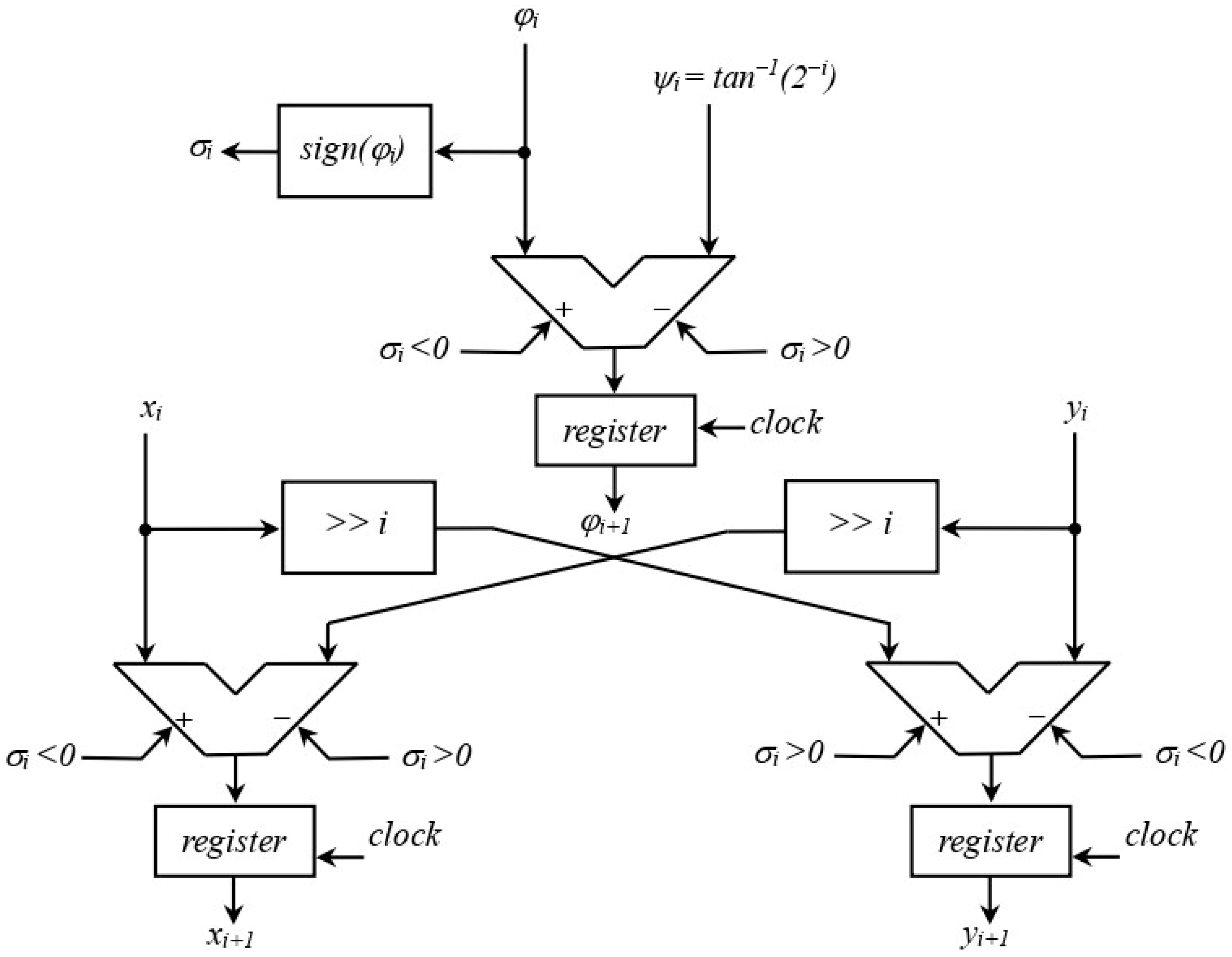 Hardware structure of the elementary cell which performs the single iteration of the CORDIC algorithm.