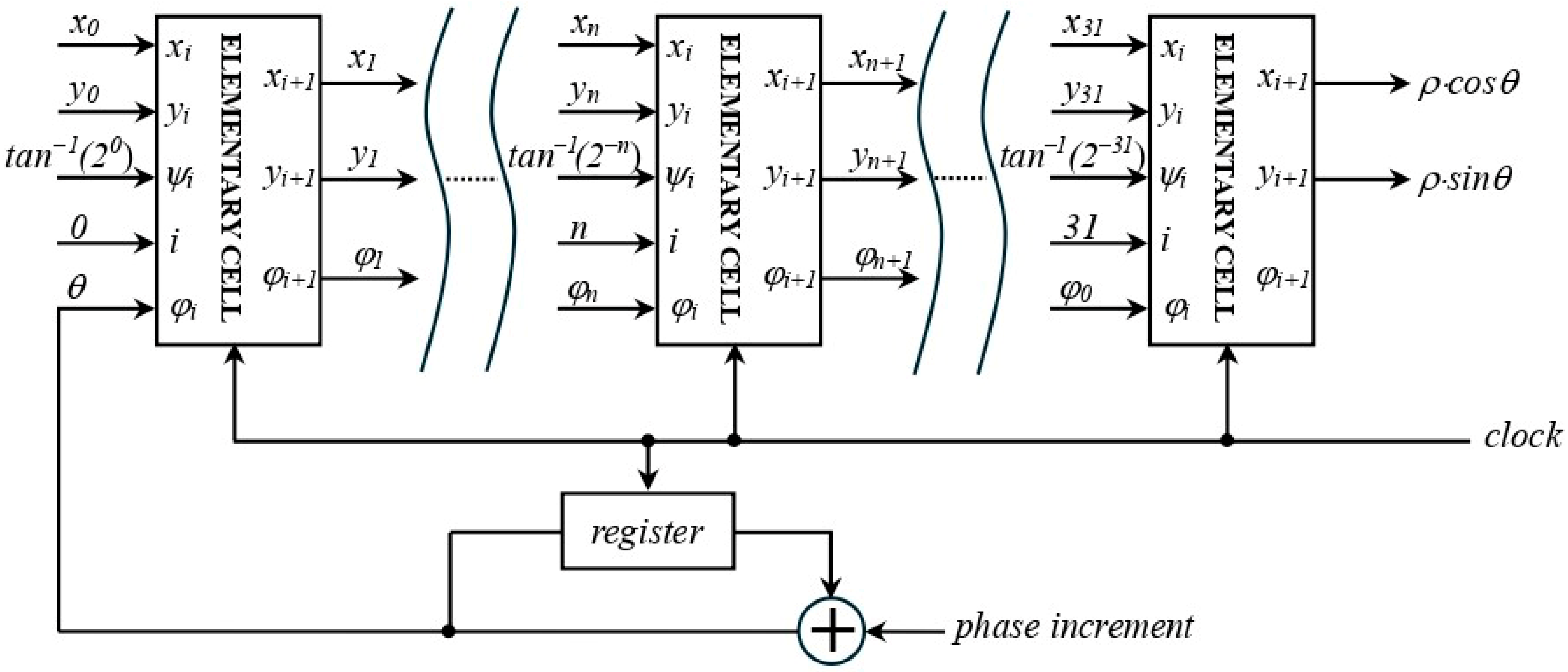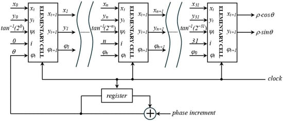 The CORDIC module is composed of the pipeline of elementary cells, as represented in Figure 10. The frequency of the generated sine waves is decided by the value assigned to the phase increment and by the clock frequency , with resolution equal to . All the digital signals are 32-bit words, and the values of the elementary rotation angles are stored in a very small look-up table. The accuracy of the digital sine wave samples depends on the phase noise of the clock signal, generated by a stable crystal oscillator, and on the intrinsic error of the CORDIC algorithm, which is very low for 32 iterations, of the order of .