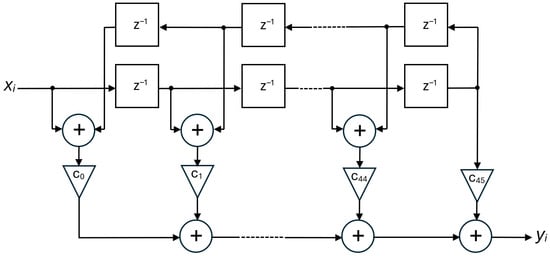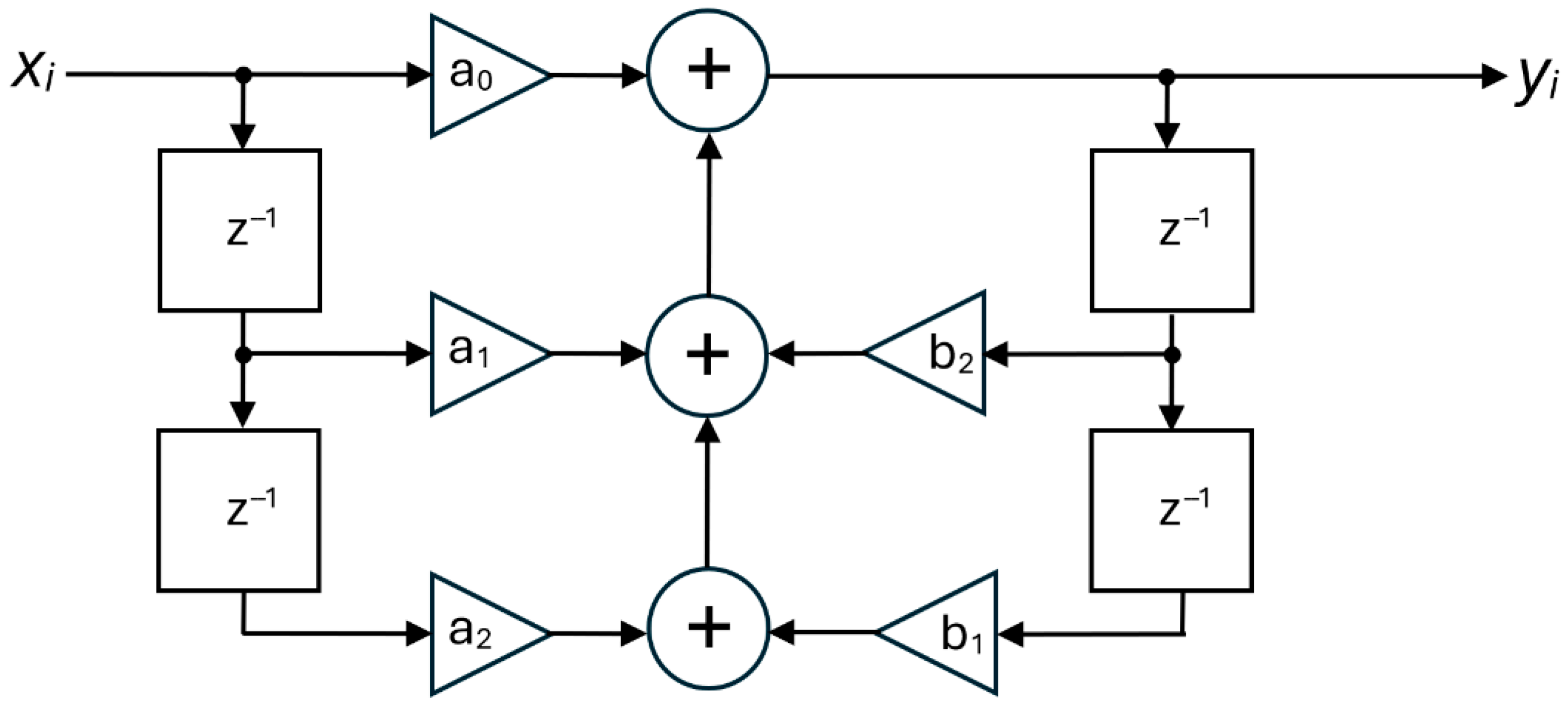 The input filter has a complex, three-stage architecture. The first stage is a simple moving average filter, implemented with a first-order cascaded integrator–comb (CIC) structure, which also performs decimation by a factor of 32. The second stage is a fifth-order shaping filter, useful for improving the transition band characteristics, and the third stage is a sixth-order, type II Chebyshev filter. In particular, the last stage is composed of three cascaded biquad sections, each realized according to the classic second-order recursive linear filter architecture, shown in Figure 13.