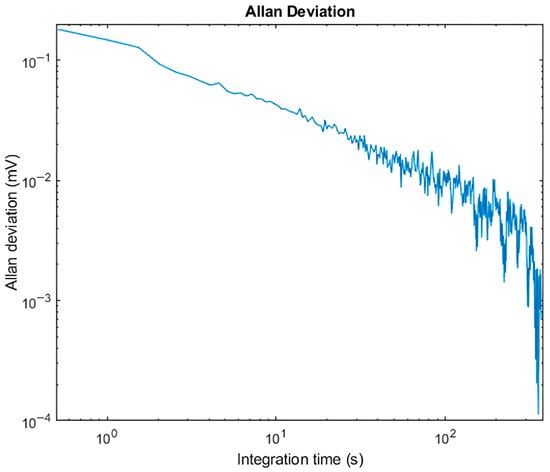 The Allan deviation for the QEPAS sensor was also measured in order to evaluate the stability of the system over time and is represented in Figure 18, which reports the noise level in mV as a function of the integration time . Results for long values of the integration time were obtained by averaging output samples obtained using its maximum allowed value. A longer results in improved noise suppression, and the measured behavior results are consistent with the one expected for an averaged white noise. Measurements were performed with the laser turned on and frequency-locked far from the H2O absorption line, ensuring that no absorption signal contributed to the output.