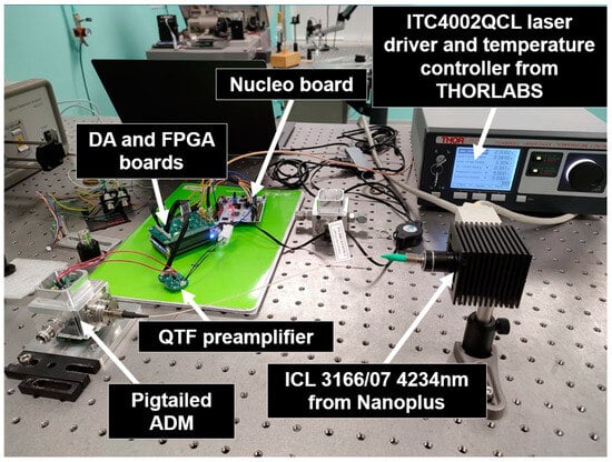 Additional tests were carried out using a different experimental setup. In this case, an ICL 3166/07 interband cascade laser, from Nanoplus, Meiningen, Germany, operating at 4234 nm was employed to target CO2 in ambient air, and a pigtailed laser source and ADM were used. Unlike the previous setup, our preamplifier was not integrated into the ADM. In fact, the ADM was already equipped with a built-in preamplifier, which was not used. Instead, the QTF terminals were connected to the inputs of our circuit externally to the ADM by means of cables, as illustrated in Figure 19. Although this arrangement is sub-optimal in terms of signal-to-noise ratio, the primary objective was to validate the complete functionality of the latest version of the electronics in a real QEPAS environment under modified operating conditions. Concerning the laser driver and the temperature controller, an ITC4002QCL laboratory instrument, from Thorlabs, Newton, NJ, USA, was used, and to reduce its noise contributions to negligible levels, the noise reduction filter available internally was applied.