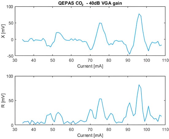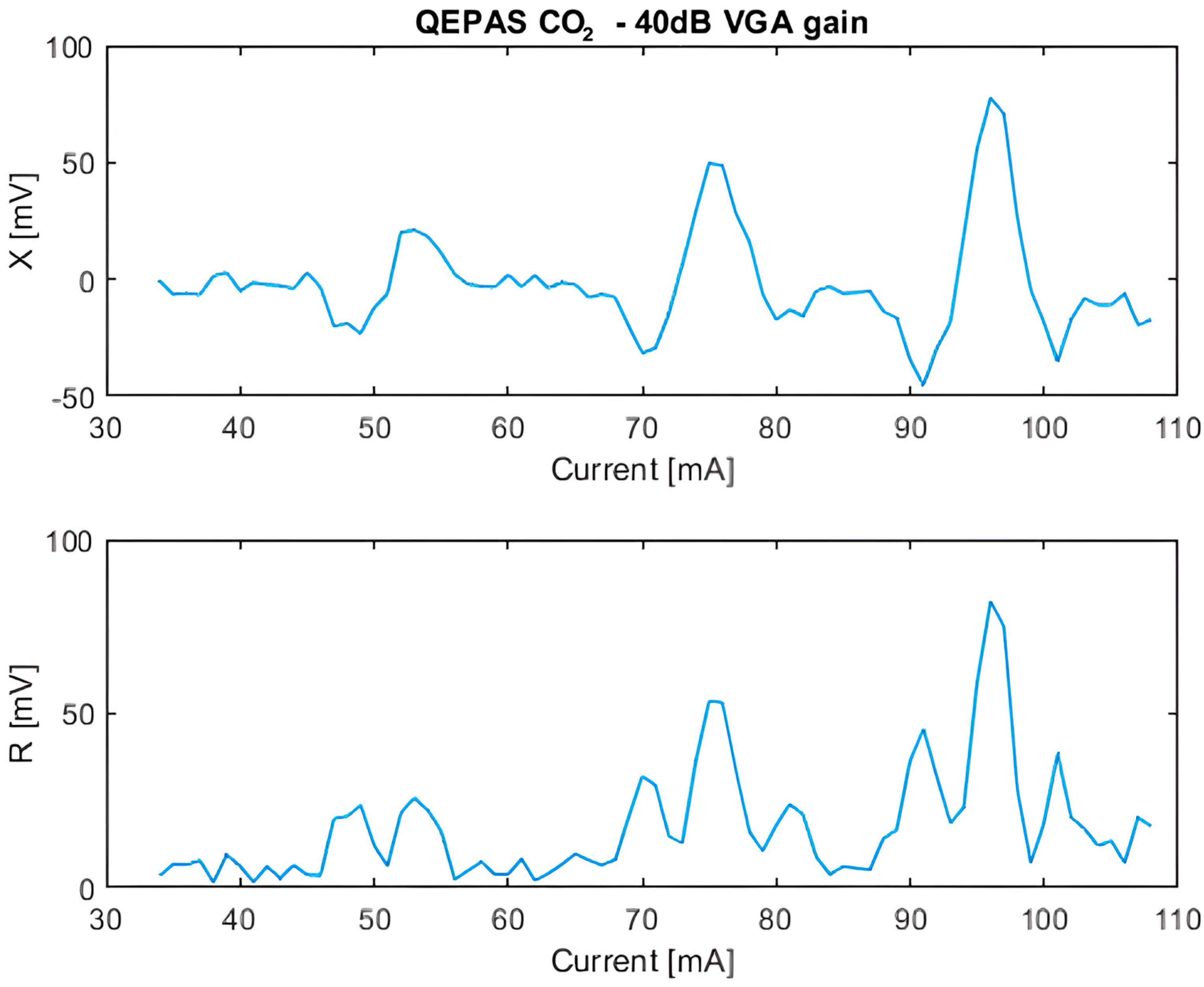 The response of the QEPAS sensor to ambient CO2 was measured. Figure 21 shows both the in-phase component X and the signal amplitude R obtained in scan mode. For this measurement, the lock-in amplifier integration time was set to its maximum value of 960 ms, and the total transimpedance gain of the preamplifier, always configured as a charge amplifier, was set to , corresponding to a VGA gain of 40 dB.
