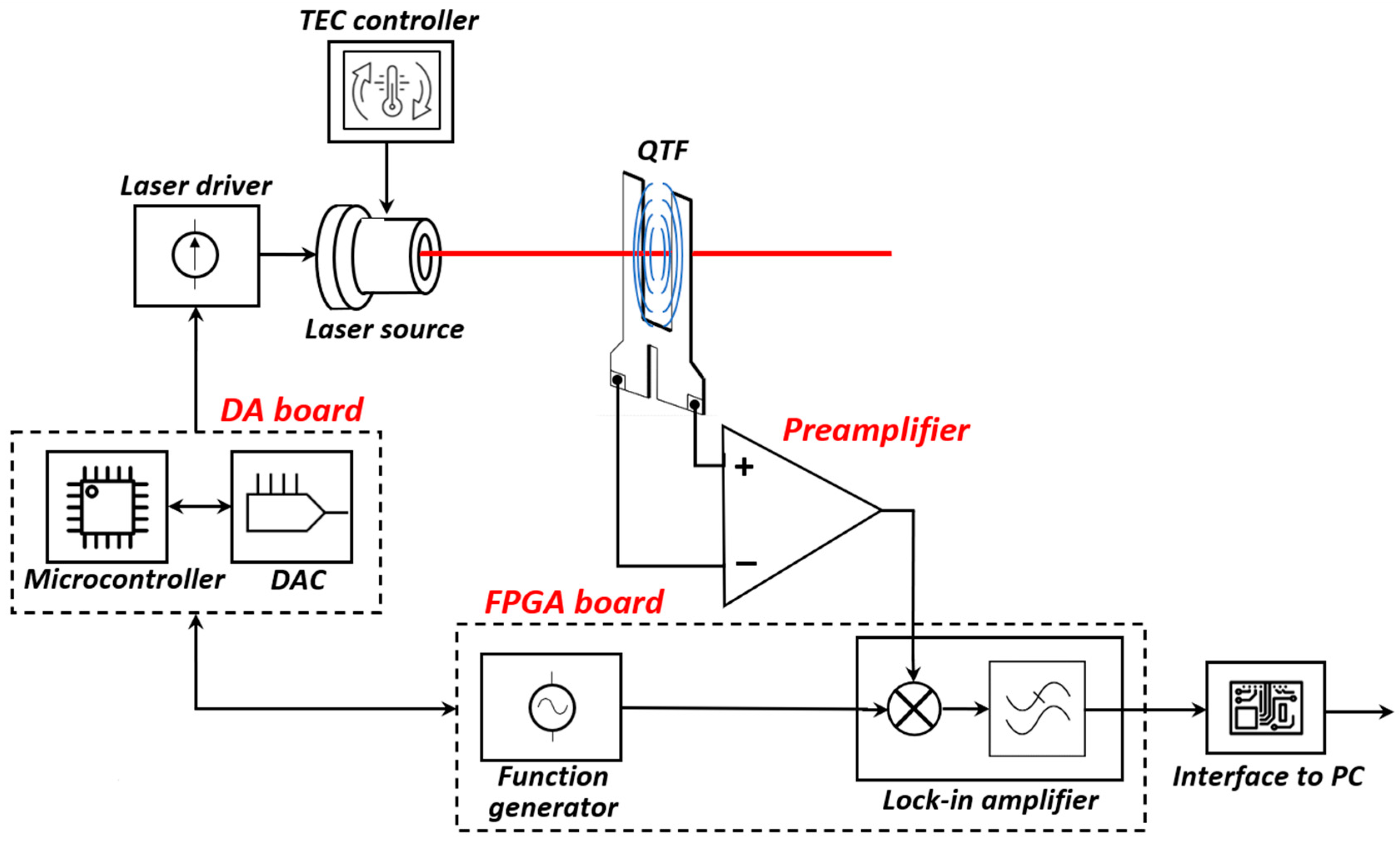 Main building blocks of a QEPAS sensor. The developed electronic blocks are highlighted in red.