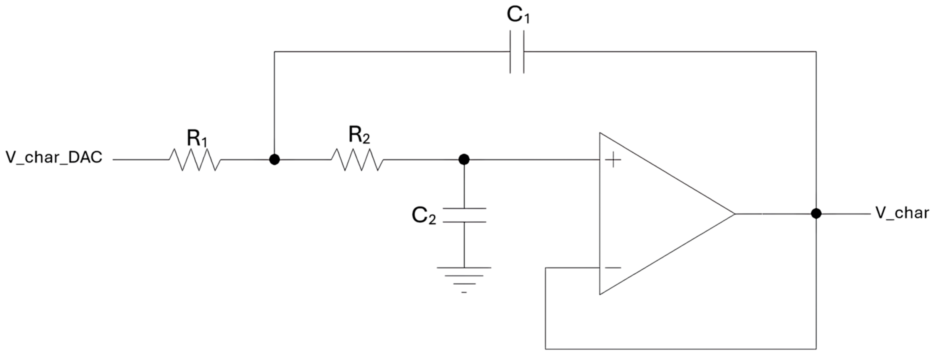 Low-pass Sallen–Key filter schematic: V_char_DAC is the output of the DAC on the preamp board, and V_char is the filtered signal applied to the QTF in characterization mode.