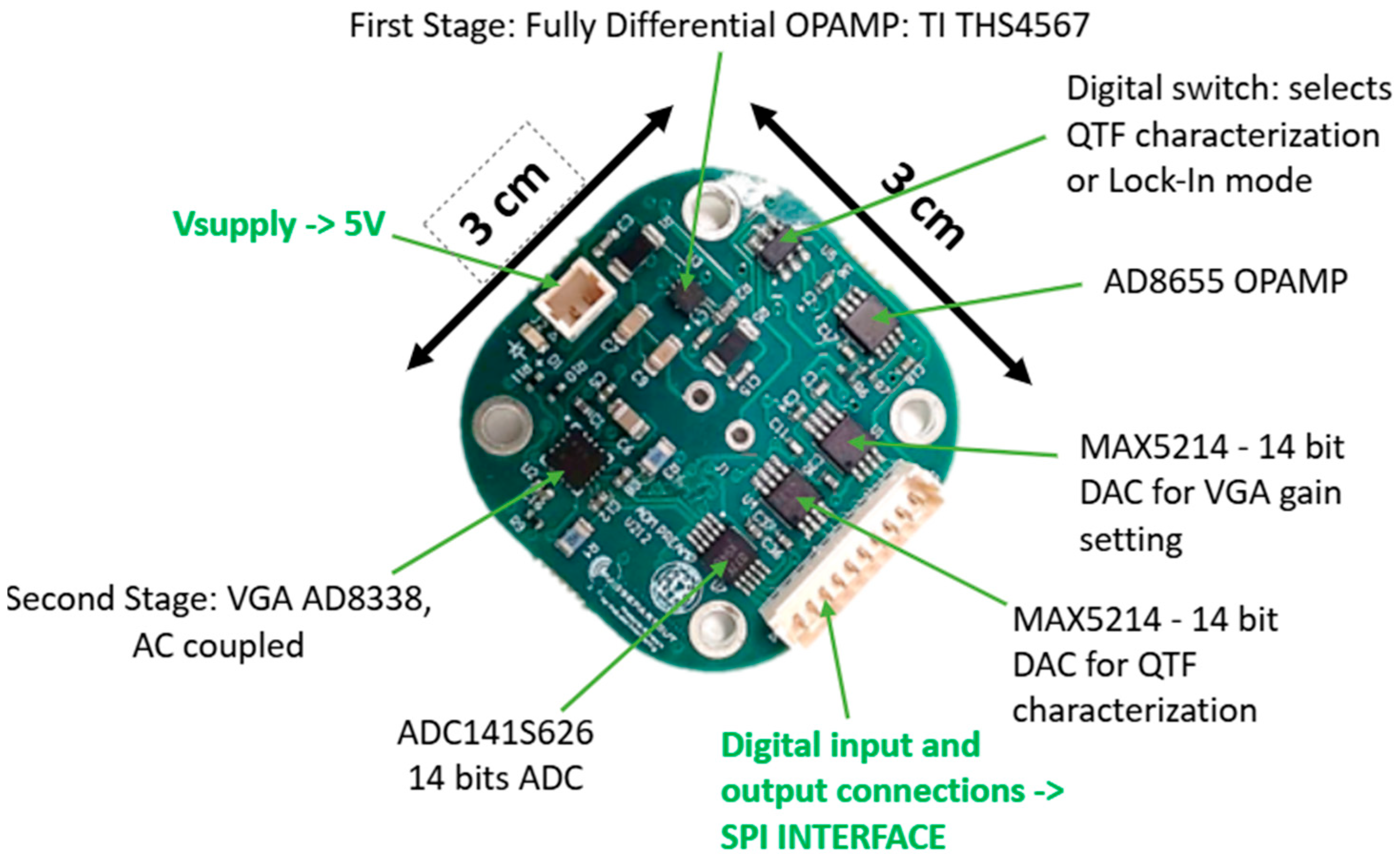 Figure 6 is a picture of the preamplifier board prototype. The connectors and all the components are clearly visible, as well as the pads for the terminals of the QTF at the center of the board. The size of the board (3 cm × 3 cm) allows its integration in the acoustic detection module (ADM) [], i.e., the small chamber with controlled temperature and pressure where the interaction between the laser beam and the target gas takes place, so that the interconnections between the terminals of the QTF and the preamplifier can be made as short as possible.