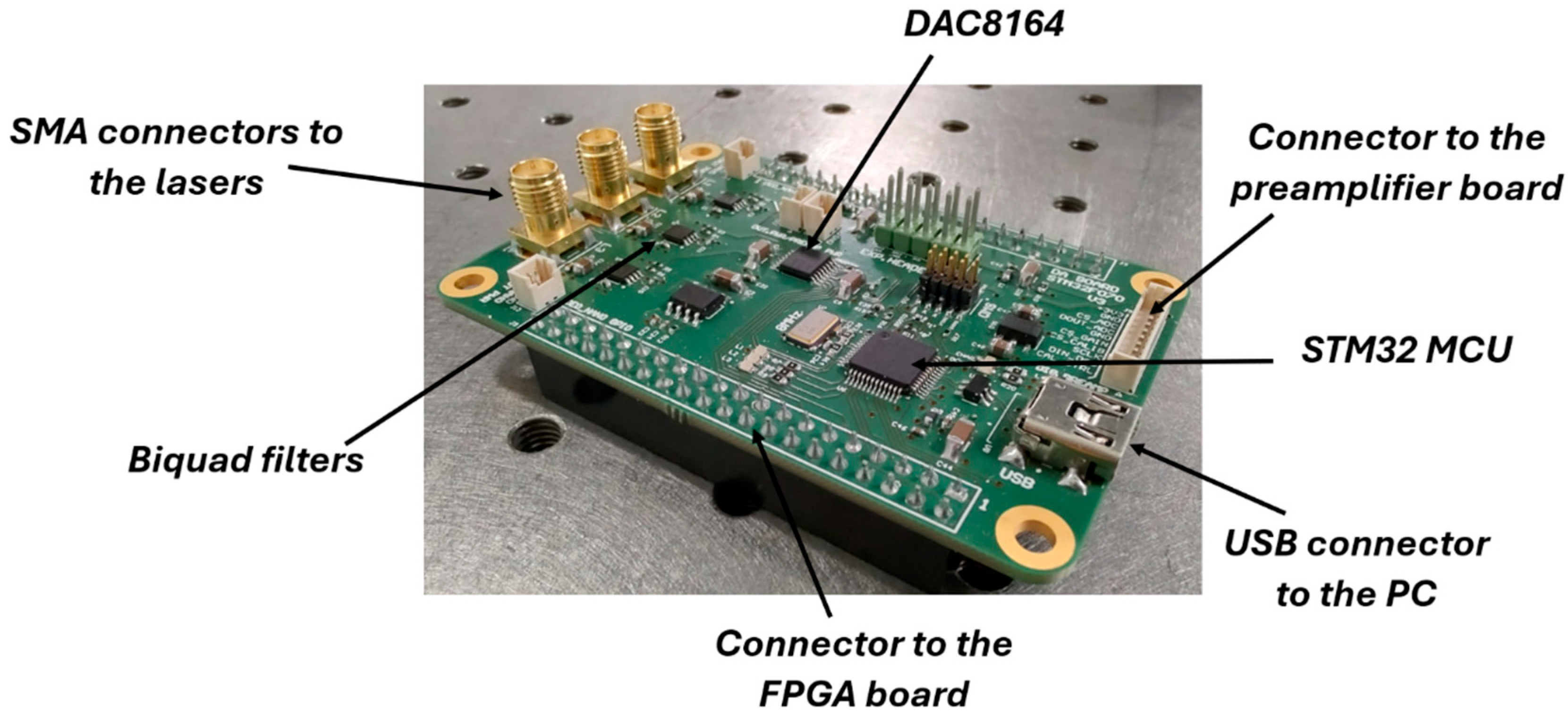 The DA board is designed to allow direct connection to the DE0-Nano FPGA board via its dual 2 × 20 pin headers. Analog output signals are routed to the laser drivers through three SMA connectors. Additionally, the board acts as a mezzanine interface, routing signals between the FPGA board, the preamplifier board, and an external NUCLEO microcontroller board, from STMicroelectronics, used for exchanging data with a host PC during the experimental tests for the functional characterization of the electronic system. Moreover, an STM32 microcontroller, from STMicroelectronics, was also integrated on the DA board, with the purpose of allowing the DA board to serve not only as a digital-to-analog converter but also as the central control unit of the system, enhancing its compactness and simplifying the interconnections.