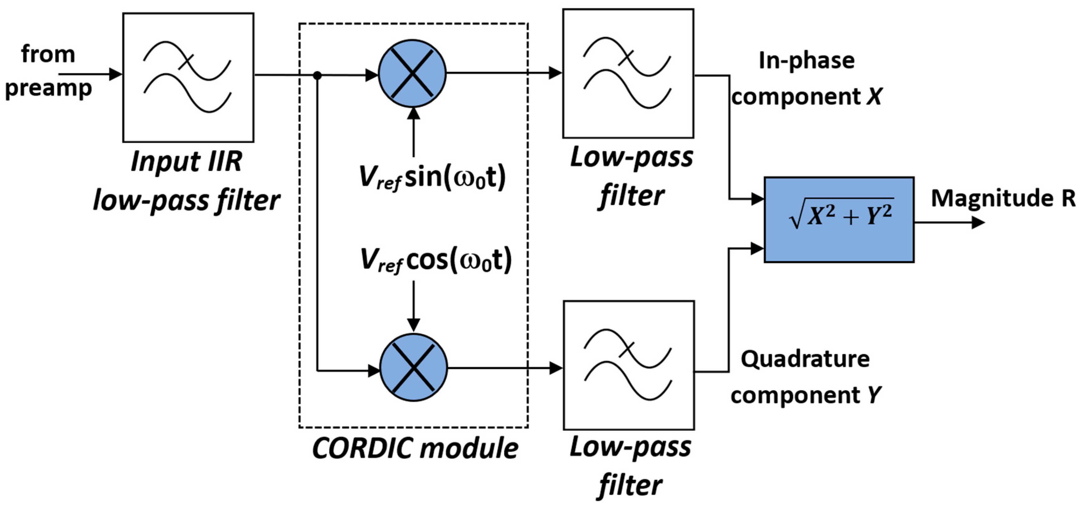 A narrow-band low-pass filter removes the high-frequency term, leaving only the DC output, proportional to the amplitude of the input signal and to the cosine of the phase difference (in-phase component, X). To eliminate the dependence on the phase , a second multiplication with a 90°-shifted reference yields the quadrature component Y. These two outputs form complex vectors, which are sent from the LIA to the microcontroller, where signal amplitude and phase are computed. The basic architecture of this dual-phase LIA is reported in Figure 12.