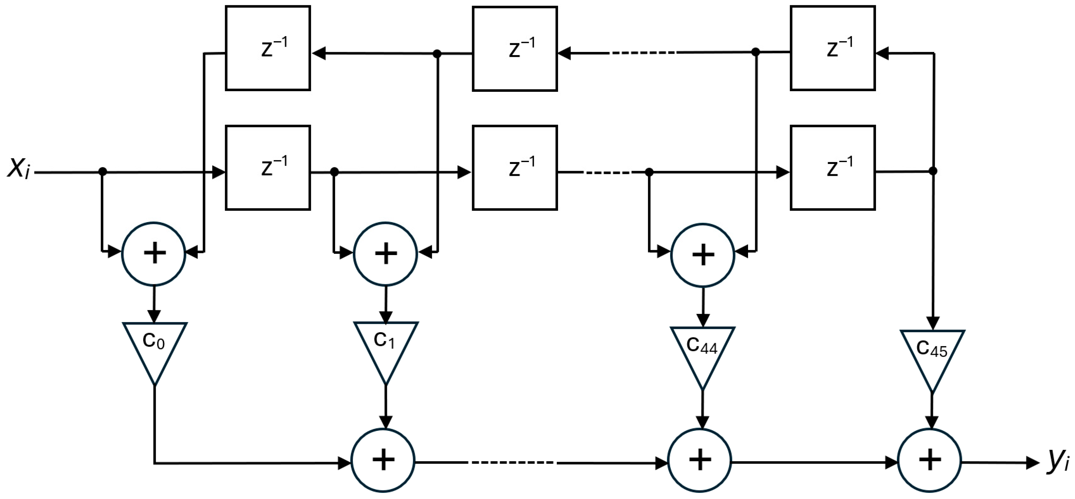As far as the low-pass output filters in Figure 12 are concerned, they are composed of two cascaded stages. The first one has the same structure as the input IIR filter previously described, whereas the second one is a 90-tap FIR filter with a folded structure, schematically depicted in Figure 15, which reduces the number of complex multiplications by about 50%.