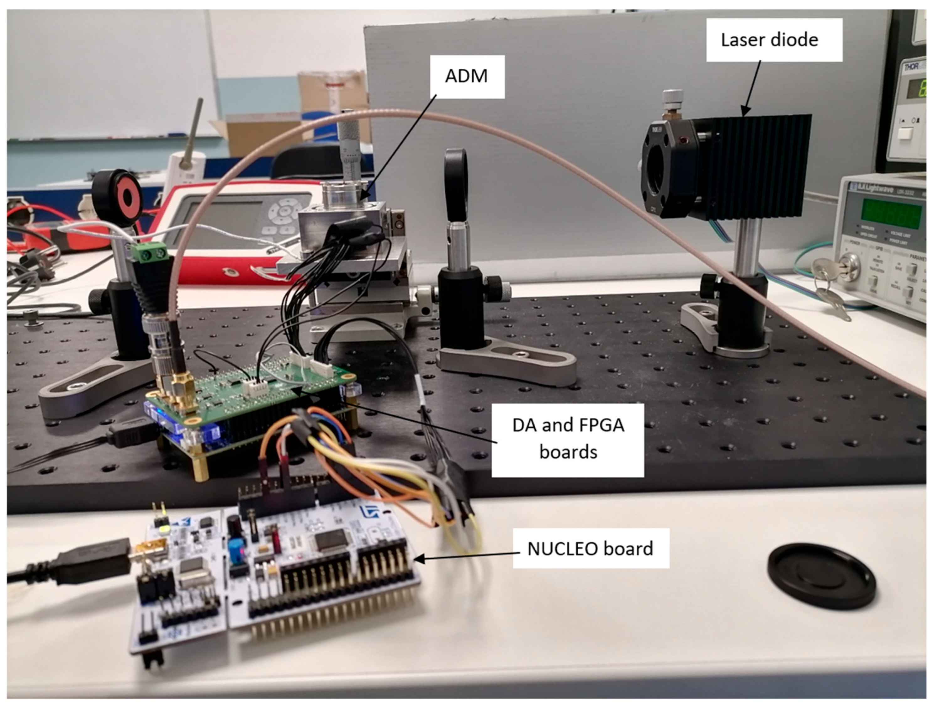 The laser source used is a 1392 nm DFB laser diode from Nanoplus. The preamplifier, configured as a charge amplifier with , and , is assembled into the ADM and is not visible in the picture shown in Figure 16. The FPGA provides the modulation signal to the laser driver, which is a standard lab instrument from Thorlabs, whereas temperature control of the laser source is managed by a Thorlabs TEC controller. As mentioned above, system configuration, including control of the preamplifier and FPGA, and data exchange are managed by means of the STM32 NUCLEO board, interfaced with a custom Python 3.11 GUI running on a PC.