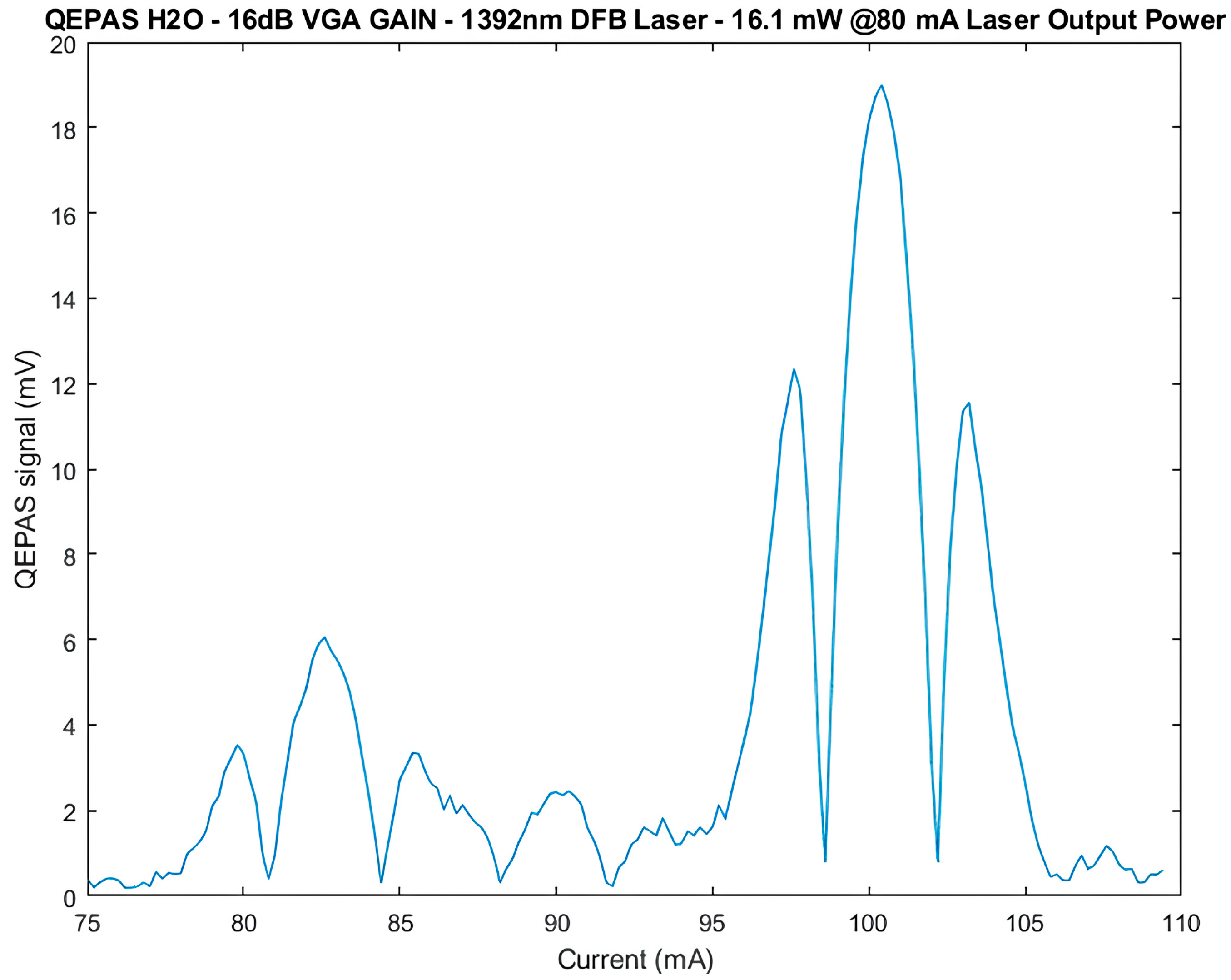 For the first tests, the QEPAS sensor was used in scan mode, the laser current was swept from 75 mA to 110 mA with steps of 1 mA, and the VGA gain was set to 16 dB. In Figure 17, the measured value of the amplitude of the QEPAS signal is reported as a function of the laser current. The signal exhibits the typical expected spectral shape for H2O, with a well-defined main lobe corresponding to the absorption peak, confirming the correct operation of the preamplifier, lock-in amplifier, function generator, and DA board.