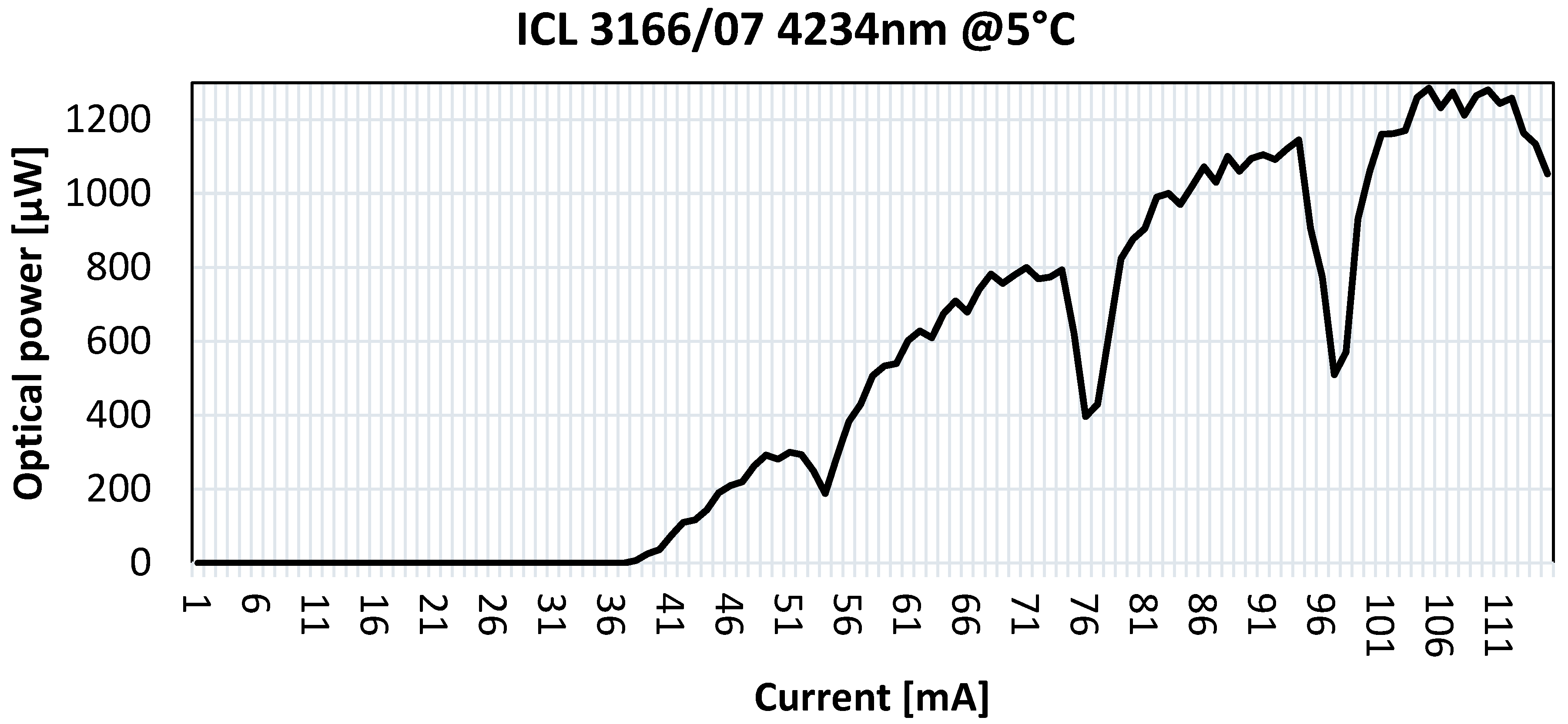 Optical power as a function of laser current, with the laser temperature stabilized at 5 °C.
