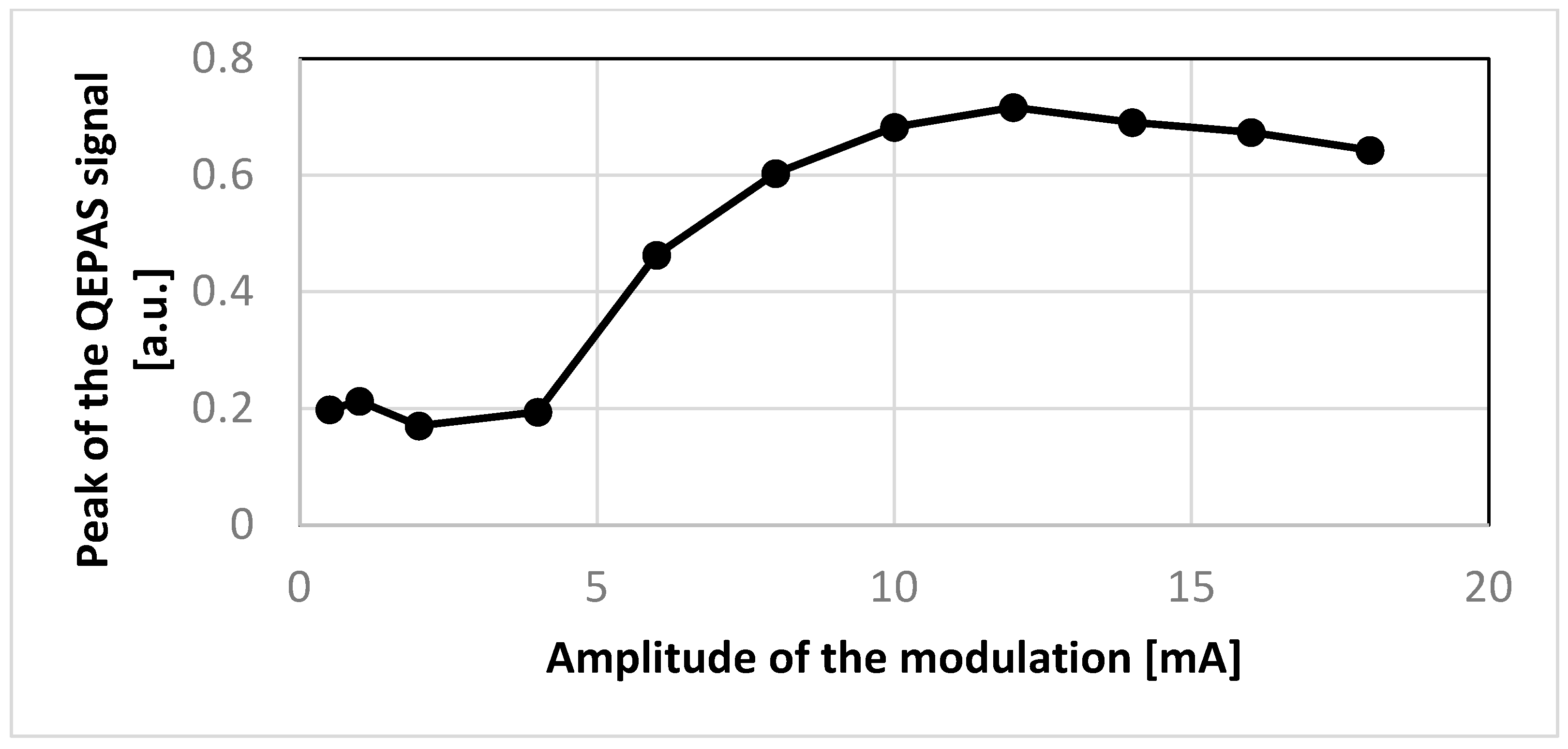 Finally, the behavior of the amplitude R of the QEPAS signal was studied as a function of the laser modulation amplitude. For this purpose, the QEPAS sensor was operated in line-locking mode, with a fixed value of the laser current set at the main peak of the QEPAS signal obtained in scan mode, i.e., 75.6 mA. As shown in Figure 22, the experimental data shows that the amplitude of the QEPAS signal increases with the modulation index, reaches a maximum, and finally starts decreasing. This closely follows the theoretical expectations [,], confirming the proper modulation behavior of the laser and the full functionality of the QEPAS sensor based on the designed electronics.