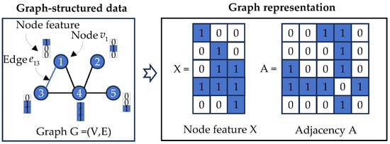 A graph is a non-Euclidean data structure extensively employed to represent complex inter-entity relationships in real-world systems, including social networks, molecular structures, and sensor arrays. Mathematically, a graph is formally defined as , where represents the vertex set comprising nodes, with each node corresponding to a discrete entity or object; denotes the edge set, characterizing interconnection relationships between nodes. For computational processing, graph structures are typically encoded through a node feature matrix , encapsulating original nodal attributes (where indicates feature dimensionality), and an adjacency matrix , where entry quantifies the edge existence between node pairs. Figure 1 demonstrates a representative graph structure containing five nodes.