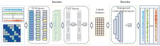 During the model training phase, the optimization objective is set to minimize the Mean Squared Error (MSE) between input and output sequences. All trainable parameters in both the encoder and decoder are iteratively updated through the backpropagation algorithm, ensuring the model systematically minimizes the deviation between original inputs and their reconstructed counterparts. Notably, the MSE metric serves a dual purpose as the fundamental indicator for damage detection: under structural healthy conditions, the MSE values follow a stable statistical distribution, whereas the emergence of structural damage causes localized MSE values corresponding to anomalous sensors to exhibit marked deviation from the established healthy pattern. The complete TCNGAT-AE architecture is schematically presented in Figure 3.