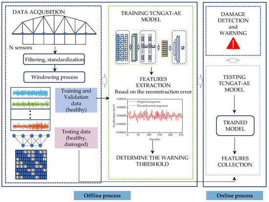 This paper proposes an unsupervised damage detection framework model based on TCNGAT-AE, which achieves collaborative extraction of spatiotemporal features from structural responses by integrating the temporal modeling capability of TCN with spatial correlation mining advantages of GAT. Building upon this model, we establish an unsupervised framework for near-real-time damage detection, comprising two core operational processes: offline training and online detection, as detailed below.