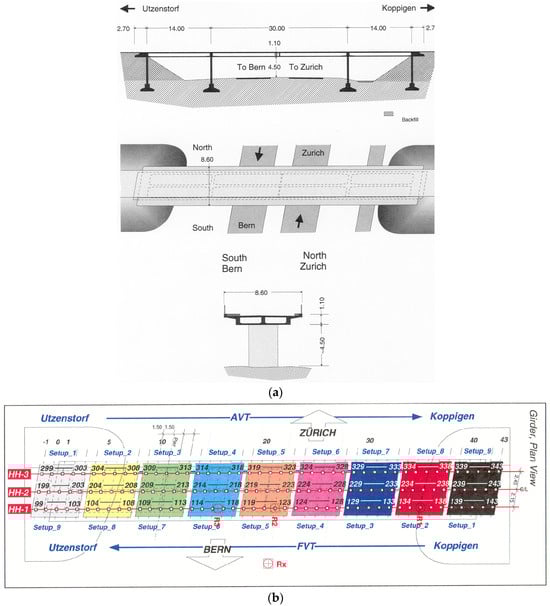 (a) Schematic diagram of the Z-24 bridge structure (unit: m); (b) Schematic diagram of the sensor layout configuration (unit: m).
