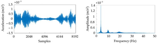 The window size selection for the Z-24 bridge was optimized to achieve an optimal balance between near-real-time damage detection and feature extraction accuracy, taking into account its environmental excitation characteristics. With a 100 Hz sampling frequency, a 256-point window configuration (equivalent to 2.56 s duration) was established. This temporal length ensures local signal stationarity while satisfying the practical constraints of near-real-time processing latency. Furthermore, it adequately captures the complete multi-mode structural responses characteristic of environmental vibration conditions. The selected window parameters provide a solid foundation for reliable feature extraction and effective model training. Figure 6 presents the acceleration time-history and corresponding frequency spectrum obtained from a representative sensor installed on the Z-24 bridge, illustrating the signal characteristics under this configuration [41].